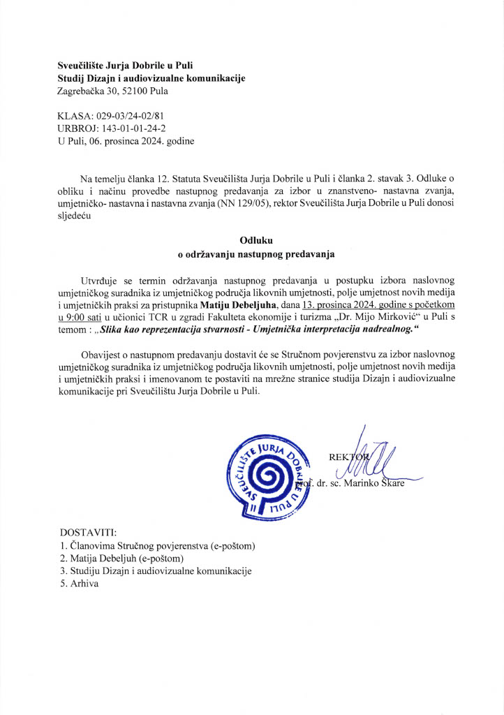 Utvrđuje se termin održavanja nastupnog predavanja u postupku izbora naslovnog umjetničkog suradnika iz umjetničkog područja likovnih umjetnosti, polje umjetnost novih medija i umjetničkih praksi za pristupnika Matiju Debeljuha, dana 13. prosinca 2024. godine s početkom u 9:00 sati u učionici TCR u zgradi Fakulteta ekonomije i turizma,,Dr. Mijo Mirković" u Puli s temom : ,,Slika kao reprezentacija stvarnosti - Umjetnička interpretacija nadrealnog."