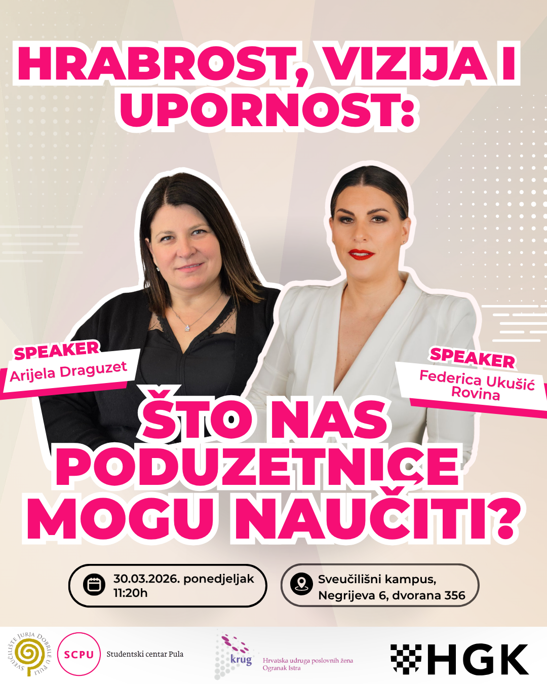 Studentski centar Pula, u suradnji s HGK (ŽK Pula), Udrugom poslovnih žena KRUG i Odsjekom za razvoj karijere i alumni UNIPU-a, ponovno organizira predavanje za sve studente s ciljem pripreme za nadolazeću sezonu i približavanja realnog sektora. Uz gostoprimstvo Fakulteta odgojno-obrazovnih znanosti, predavanje će se održati na Sveučilišnom kampusu u Puli.