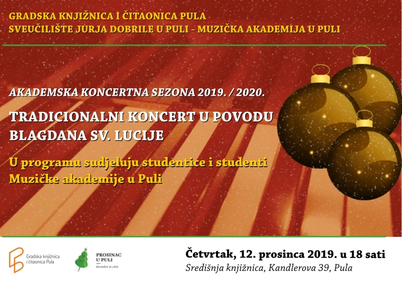 U sklopu manifestacije "Prosinac u Puli" Muzička akademija u suradnji sa Gradskom knjižnicom i čitaonicom organizira tradicionalni koncert povodom blagdana Sv.Lucije, u četvrtak 12. prosinca u 18 sati.