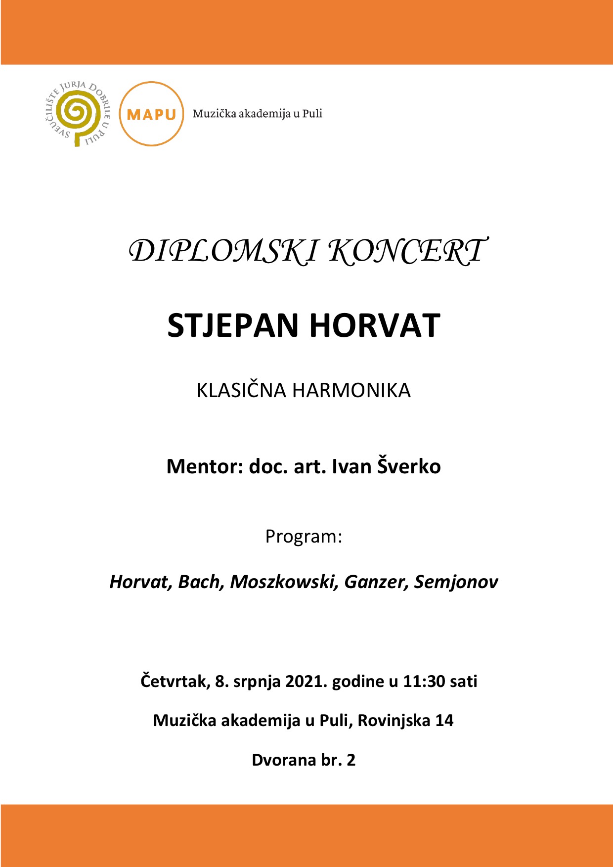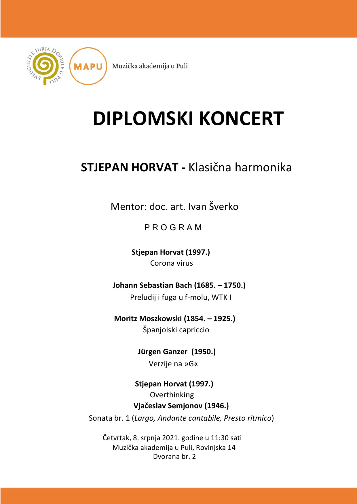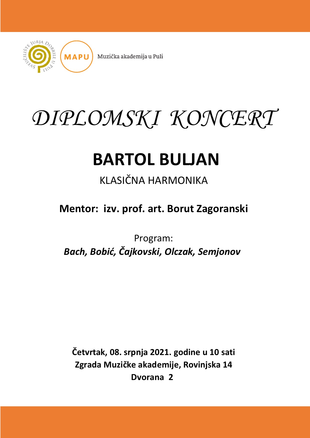 U četvrtak 8. srpnja 2021. godine studenti Odsjeka studija Klasične harmonike, Bartol Buljan u 10 sati (mentor izv. prof. art. Borut Zagoranski) i Stjepan Horvat u 11.30 (mentor doc. art. dr. art. Ivan Šverko), održat će svoje diplomske koncerte u dvorani 2 zgrade MAPU-a u Rovinjskoj ulici. U nastavku pogledajte plakate i programe koncerata.