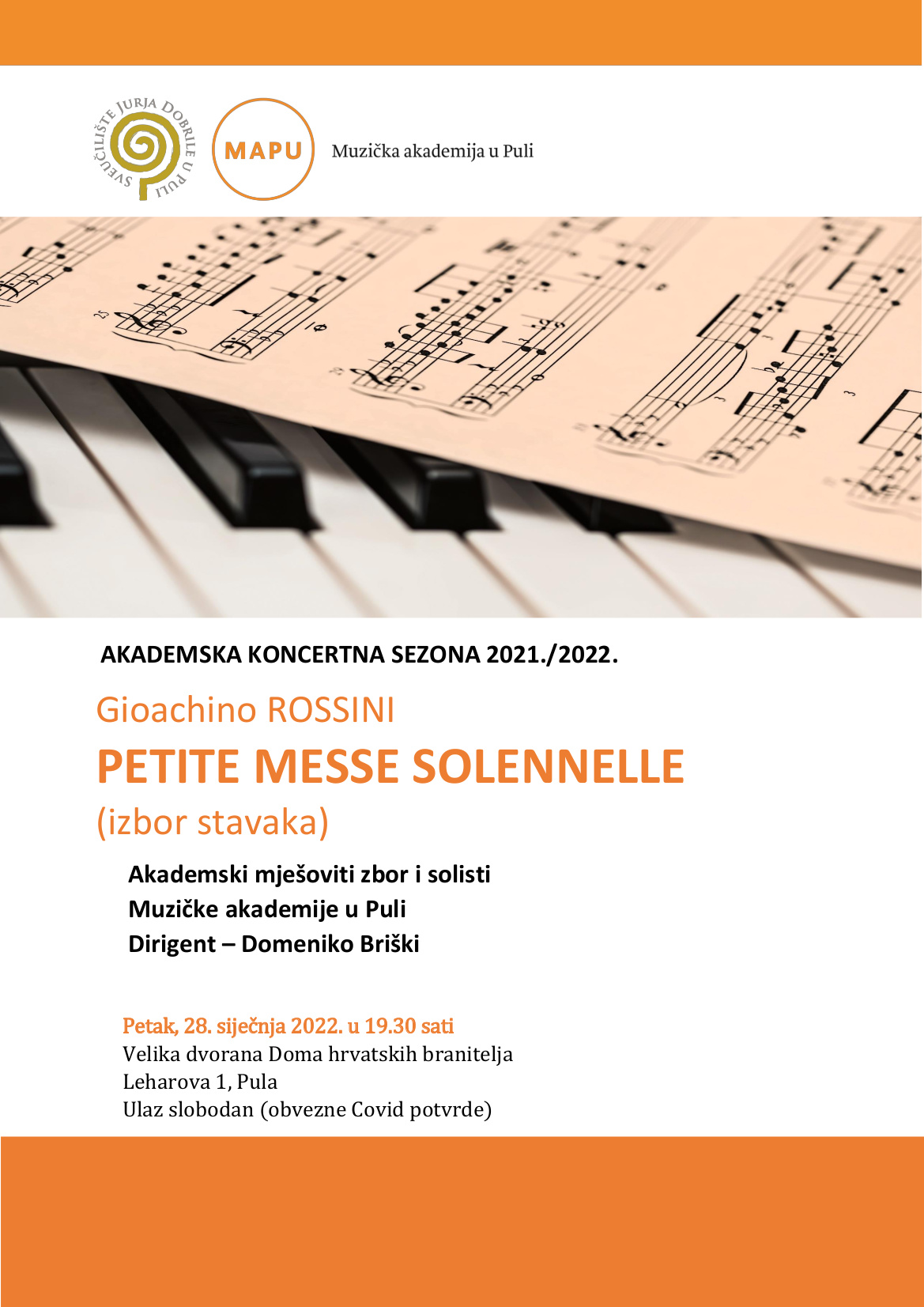 U okviru akademske koncertne sezone najavljujemo koncert studenata Muzičke akademije u Puli. Na programu će biti izbor stavaka iz djela Gioachina Rossinija "Petite messe solennelle". Koncert će se održati u petak, 28. siječnja s početkom u 19.30 u Velikoj dvorani Doma hrvatskih branitelja, Leharova 1, Pula. Ulaz je slobodan uz obvezne Covid potvrde.