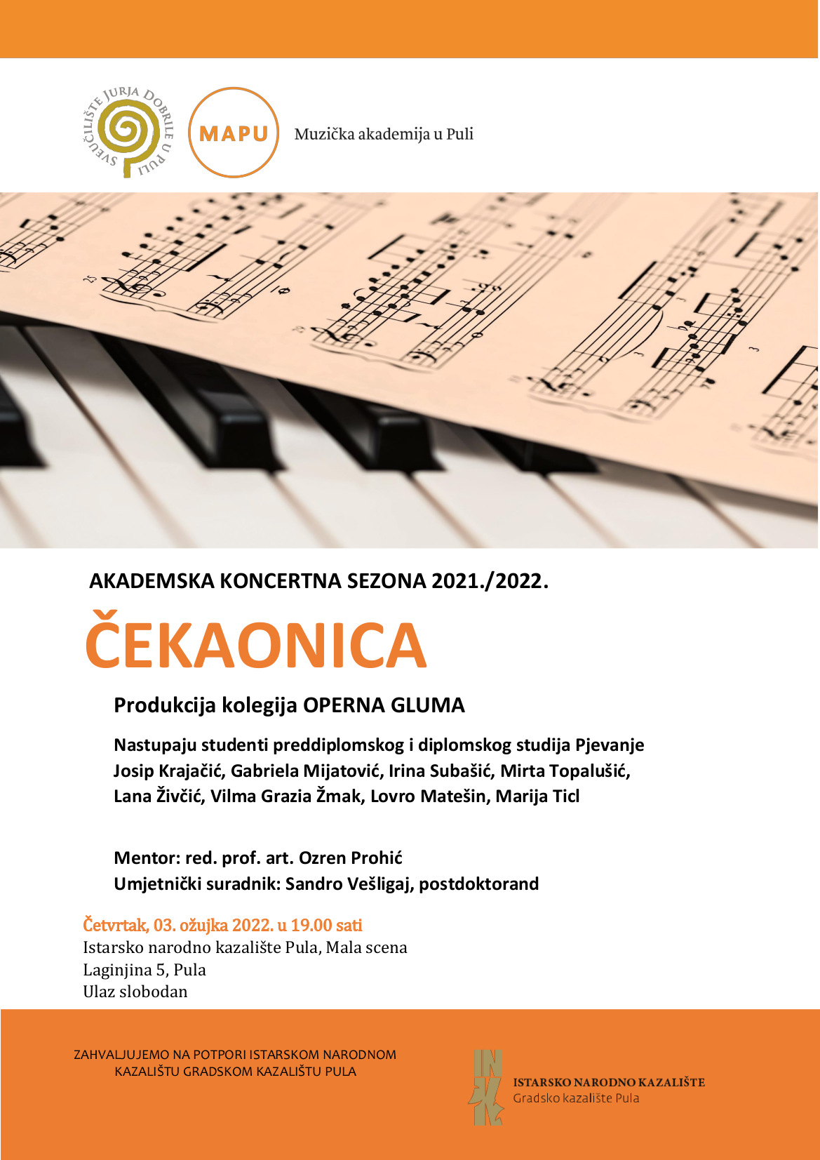 Studenti pjevanja na Muzičkoj akademiji u Puli pripremili su javnu scensku produkciju na maloj sceni INK-a u Puli, iz kolegija Operna gluma, pod mentorstvom red. prof. art. Ozrena Prohića, uz umjetničku suradnju Sandra Vešligaja. Ulaz je slobodan.
