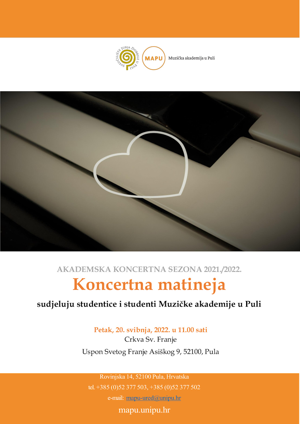 Studenti Glazbene pedagogije i Solo pjevanja pozivaju vas na 10. koncertnu klavirsku matineju. Prilika je to da odabrani program kolegija Klavir publici predstave vrijedni studenti.