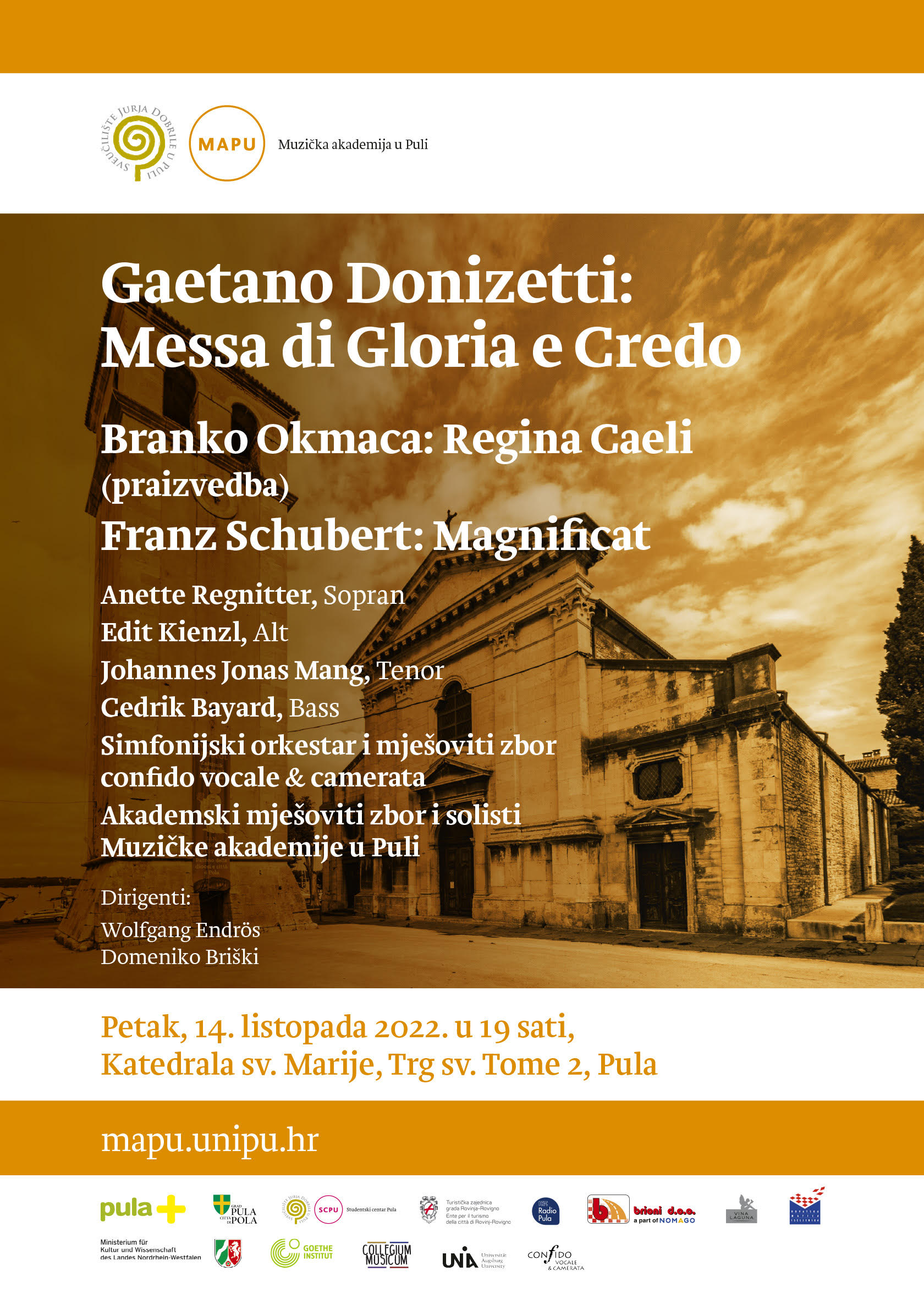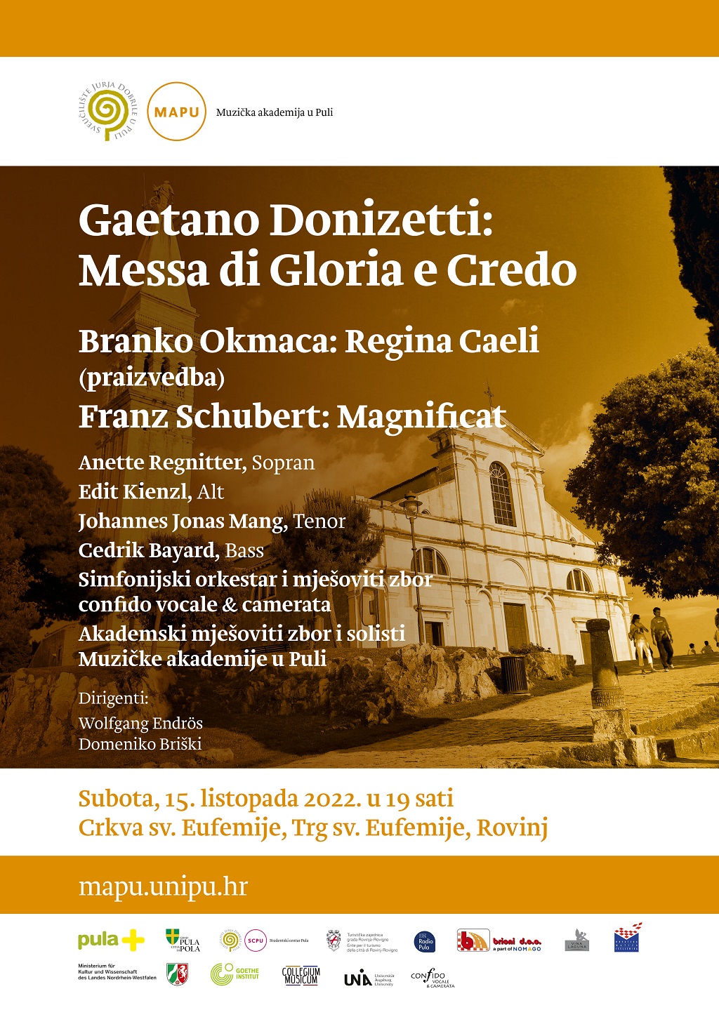 Petak, 14. listopada 2022. u 19 sati, Katedrala sv. Marije u Puli i subota, 15. listopada 2022. godine s početkom u 19 sati Crkva Sv. Eufemije u  Rovinju. Program koncerata sastavljen je od djela kompozitora iz tri države članice Europske unije: Italije, Njemačke i Hrvatske. Na koncertu će se praizvesti oratorijsko djelo napisano za tu priliku, Istarskog skladatelja i profesora na Muzičkoj akademiji u Puli, Branka  Okmace – Regina Caeli za simfonijski orkestar i zbor, te F. Schubert – Magnificat i G. Donizetti - Messa di gloria e credo.