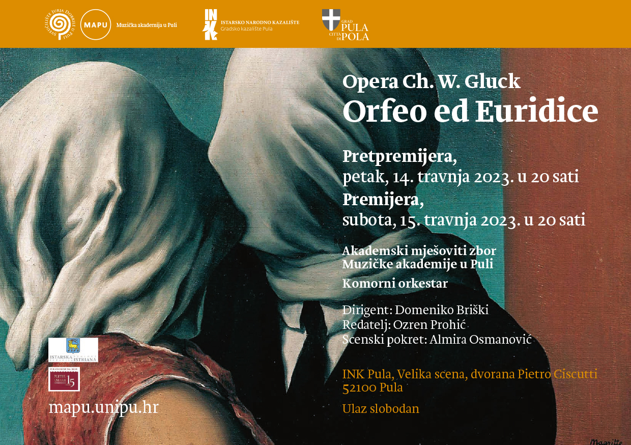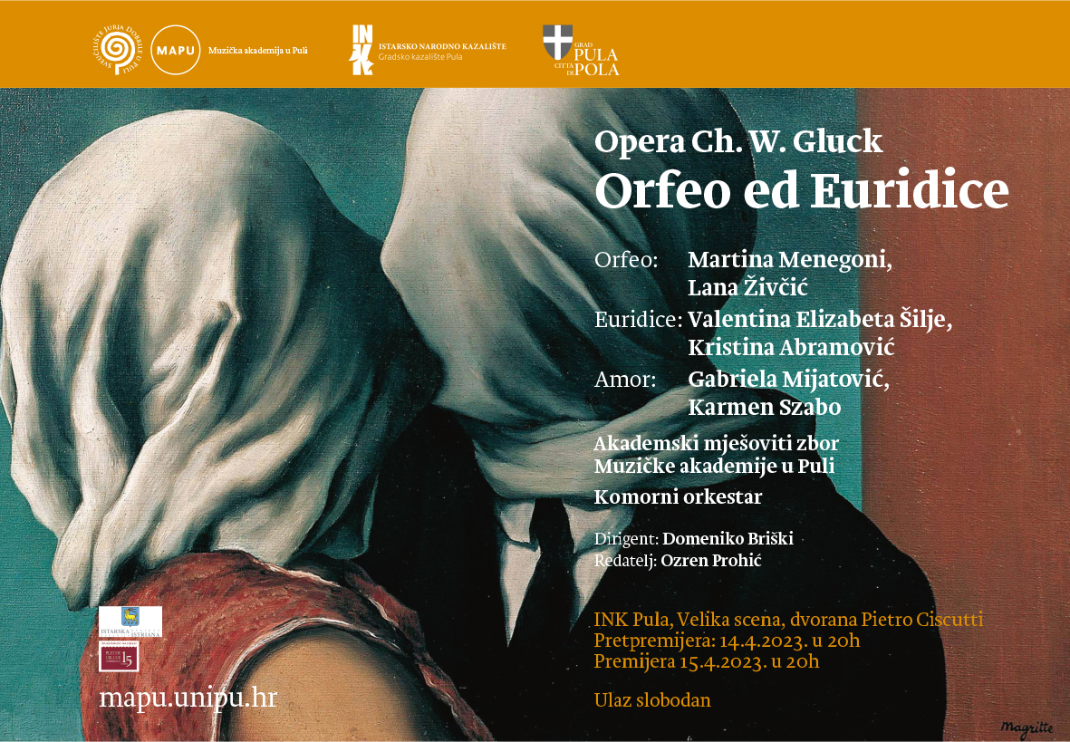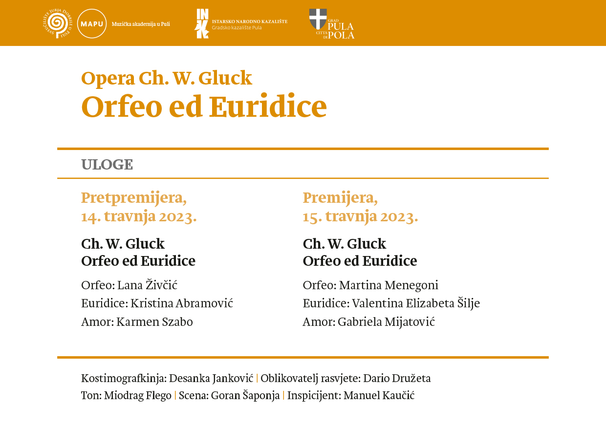 Muzička akademija sveučilišta u Puli i ove godine postavlja premijerno operu u INK. To je već naša 4. opera koju premijerno postavljamo za istarsku publiku. Ove godine postavljamo operu Orfei i Euridika, vječnu priču o ljubavi. Nastupaju najbolji studenti Muzičke akademije uz pratnju orkestra! Dvije su predstave sa čak dvije različite postave pjevača. Režiju potpisuje redatelj red. prof. art. Ozren Prohić a dirigent je izv. prof. art. Domeniko Briški. Pretpremijera je 14.4.2023 u 20 sati, a premijera dan kasnije, 15.4.2023. isto u 20.sati. Obje predstave su na velikoj sceni INK u Puli, u dvorani Pietro Ciscutti. Gluckova opera Orfej i Euridika jedna je od najpoznatijih i najizvođenijih opera uopće. Pozivamo vas!