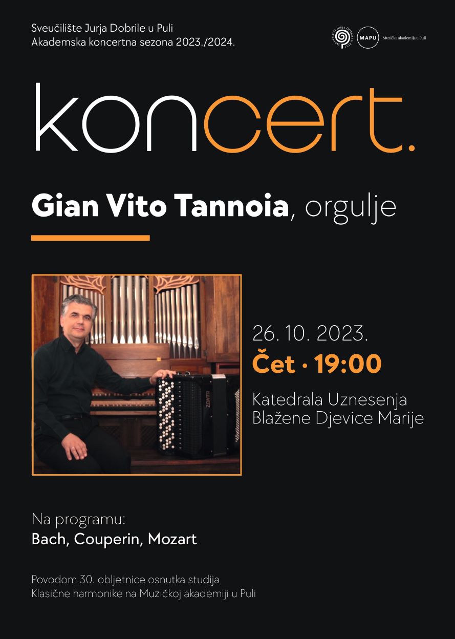 Pozivamo Vas na koncert na kojem nastupa prof. art. Gian Vito Tannoia. Koncert će se održati u Katedrali Uznesenja Blažene Djevice Marije, u četvrtak 26. listopada 2023. s početkom u 19.00 sati. Na programu su djela Bacha, Couperina i Mozarta.