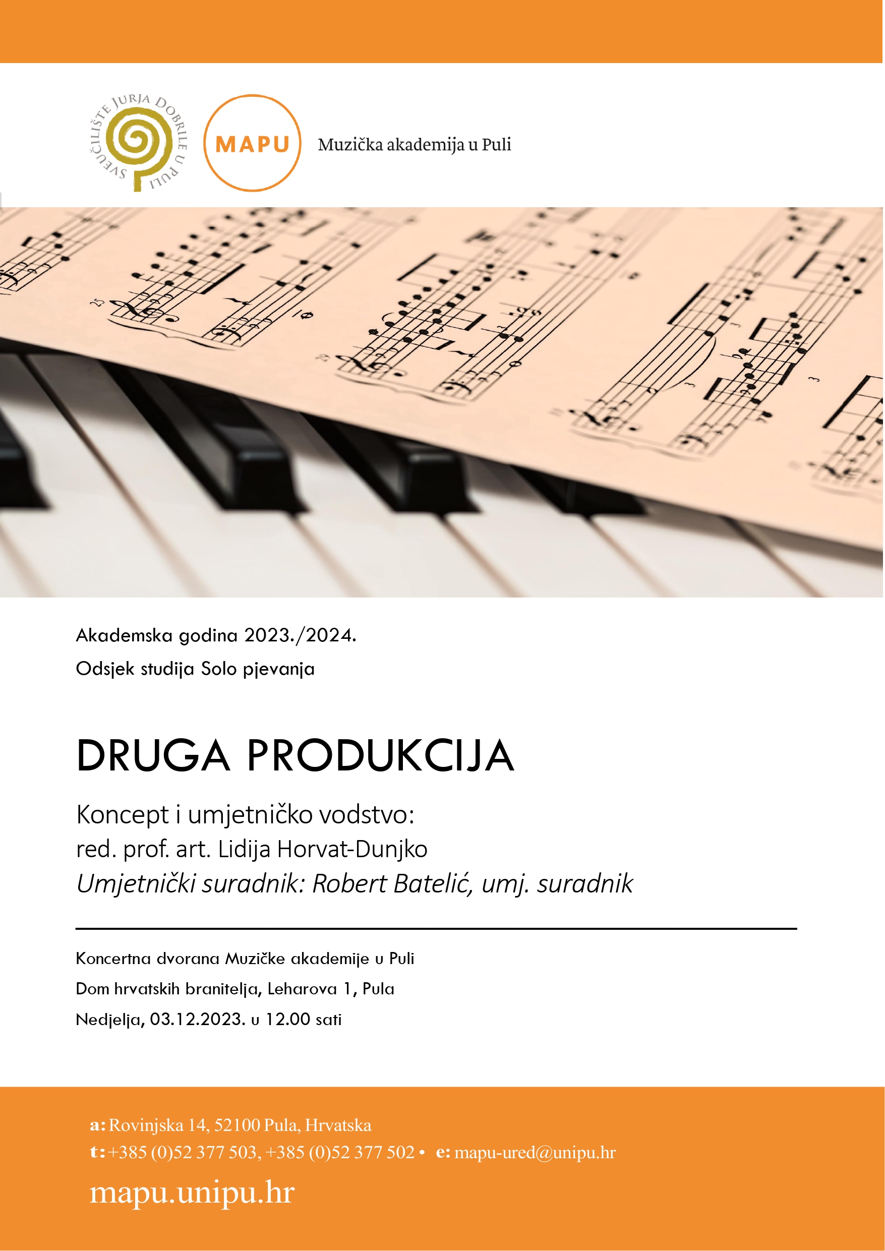 Pozivamo Vas na drugu produkciju Odsjeka za Solo pjevanje Muzičke akademije! Koncert je ostvaren uz koncept i umjetničko vodstvo red. prof. art. Lidije Horvat-Dunjko te umjetničku suradnju Roberta Batelića, umj. suradnika.