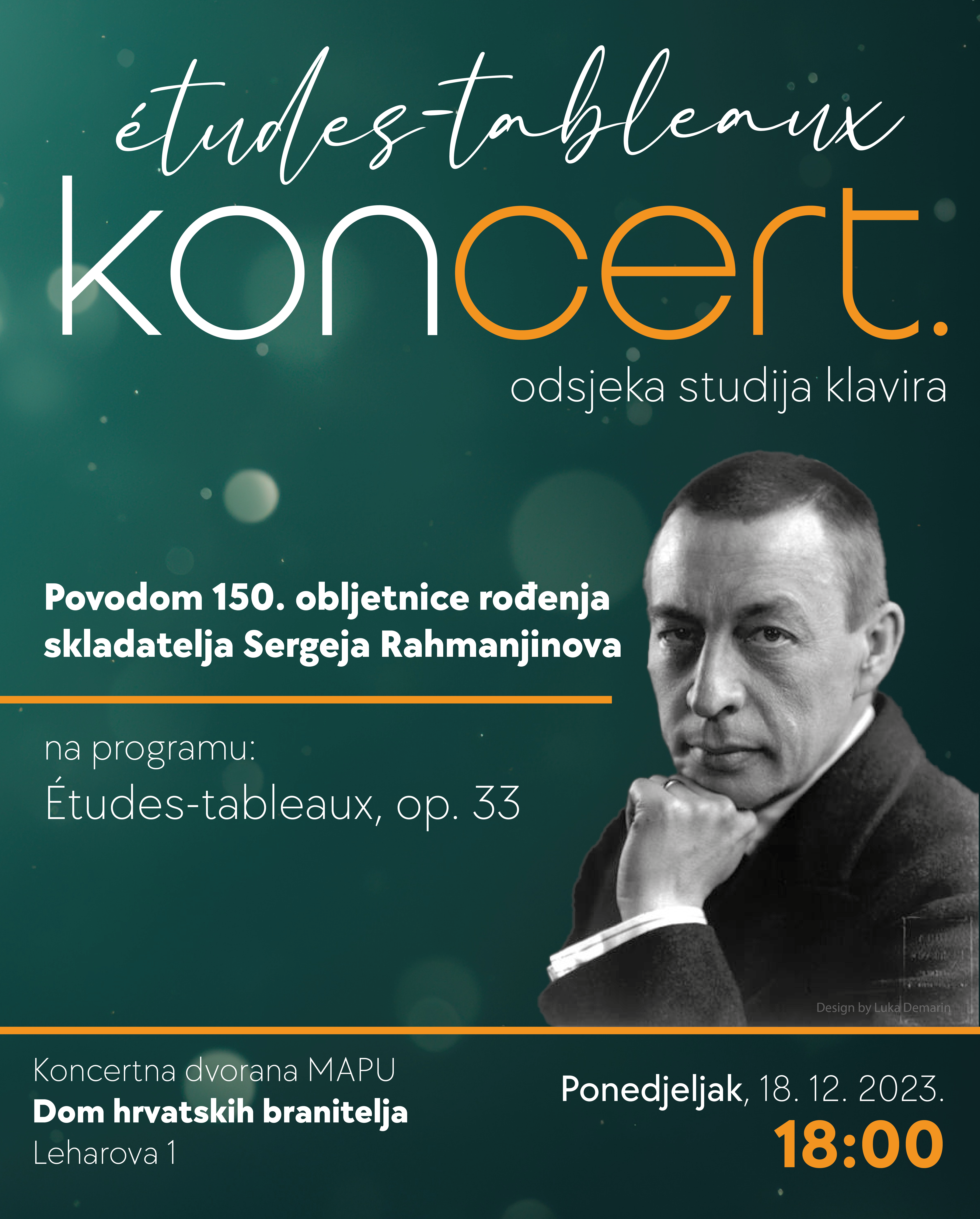 Pozivamo vas na koncert povodom 150. obljetnice rođenja Sergeja Rahmanjinova na kojem nastupaju studenti odsjeka studija klavira. Koncert će se održati u koncertnoj dvorani Muzičke akademije, u Domu hrvatskih branitelja, Leharova 1, u ponedjeljak 18. prosinca 2023. s početkom u 18.00 sati. Na programu su Études-Tableaux op.33 Sergeja Rahmanjinova. Ulaz je slobodan!