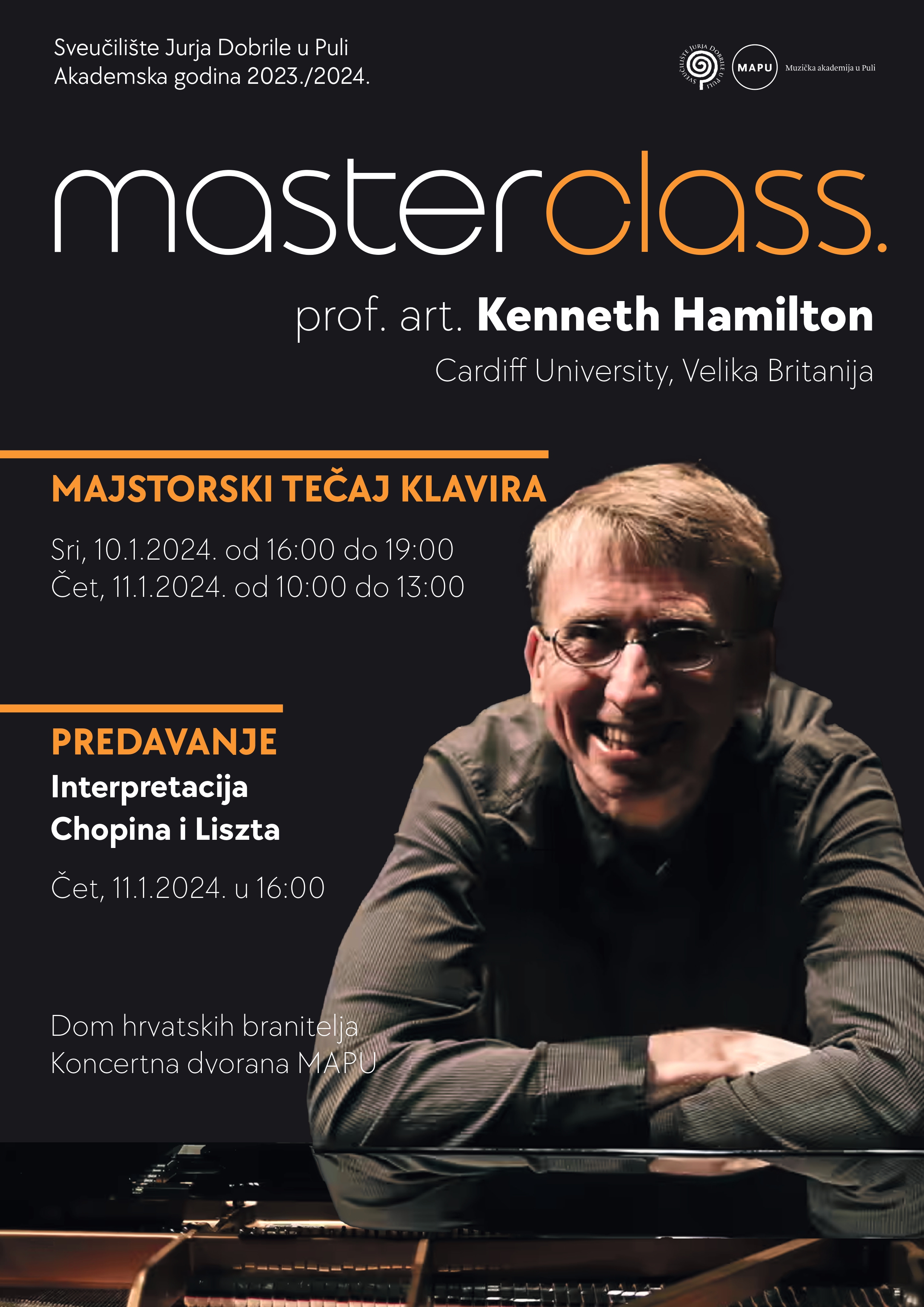 Pozivamo Vas na majstorski tečaj i predavanje koje će održati prof. art. Kenneth Hamilton s Muzičke akademije Sveučilišta Cardiff u Walesu (Ujedinjeno Kraljevstvo). Predavanje i majstorski tečaj će se održati 10. i 11. siječnja 2024. (srijeda i četvrtak) u koncertnoj dvorani MAPU (Dom hrvatskih branitelja, Leharova 1, Pula).
