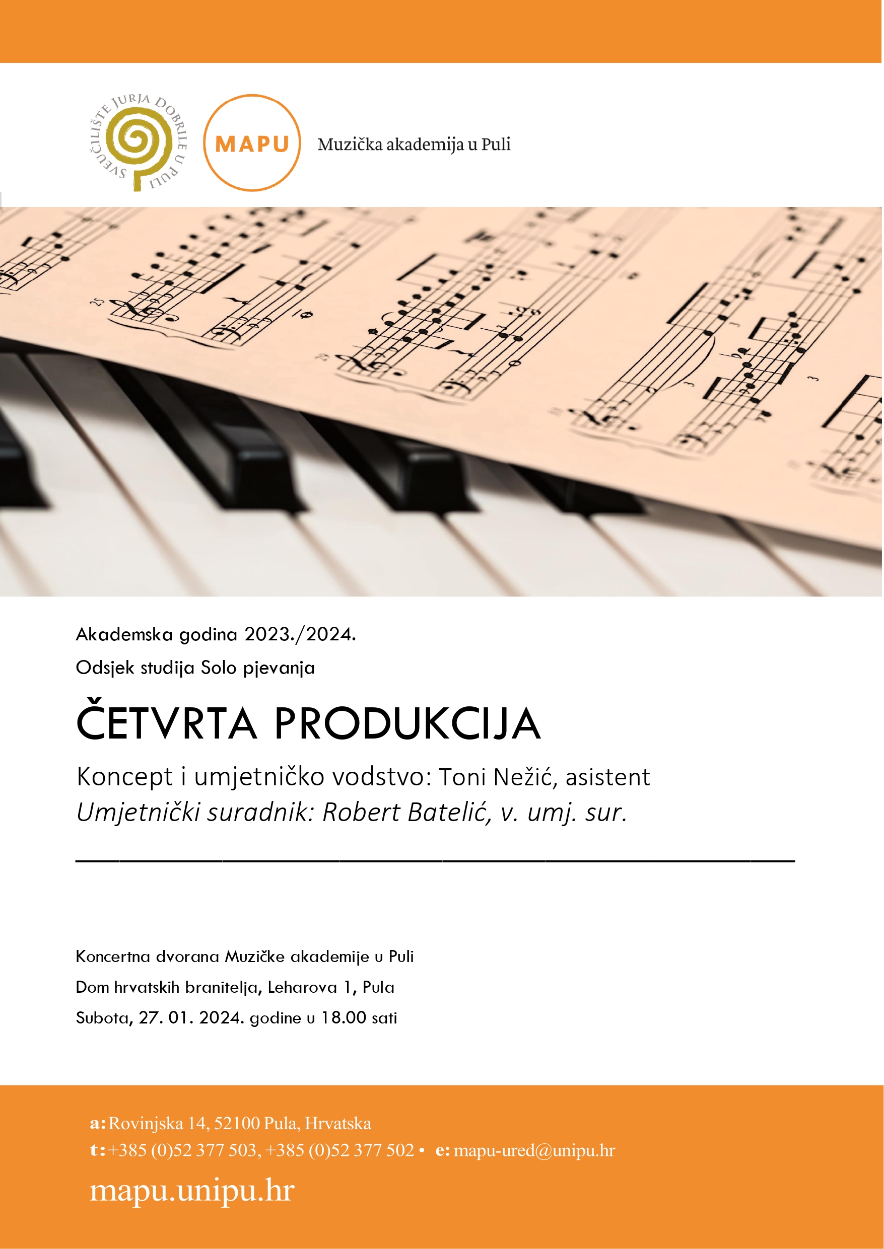 Produkcija će se održati u Koncertnoj dvorani Muzičke akademije u Puli (Dom hrvatskih branitelja, Leharova 1) u subotu, 27. 1. 2024. u 18.00 sati.