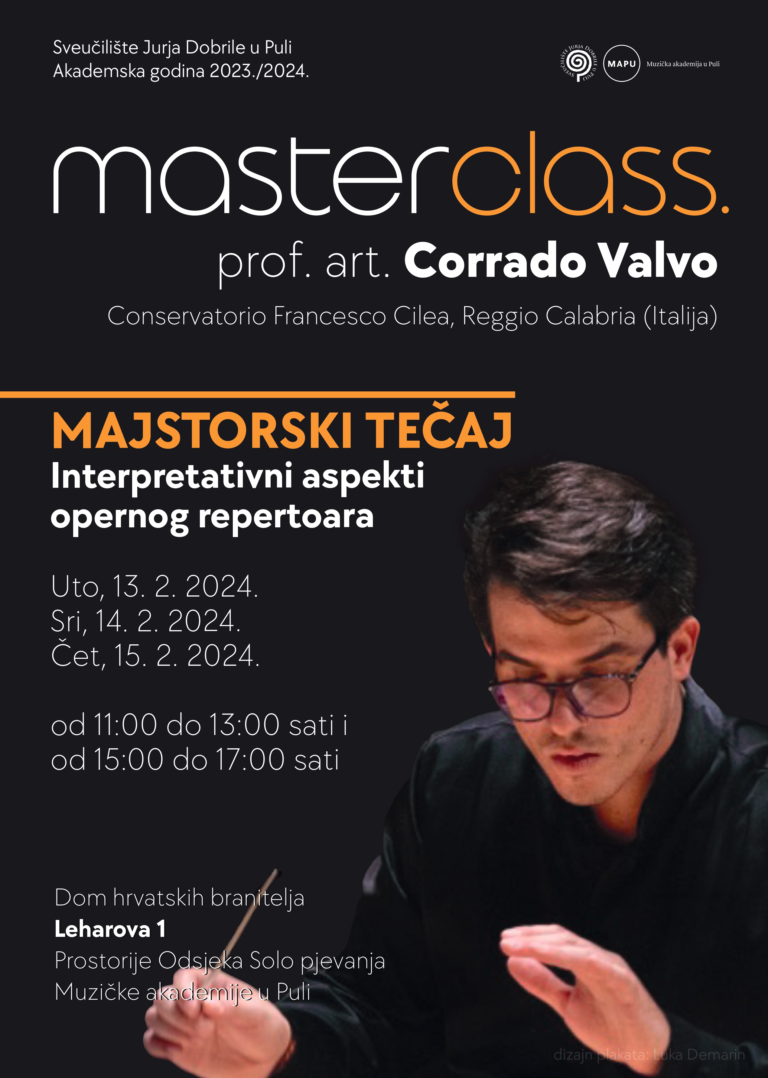 Pozivamo Vas na majstorski tečaj koje će održati prof. art. Corrado Valvo s Konzervatorija Francesco Cilea u Reggiu Calabria (Italija). Majstorski tečaj će se održati 13., 14. i 15. veljače 2024. (utorak, srijeda i četvrtak) u prostorijama Odsjeka Solo pjevanja MAPU (Dom hrvatskih branitelja, Leharova 1, Pula).