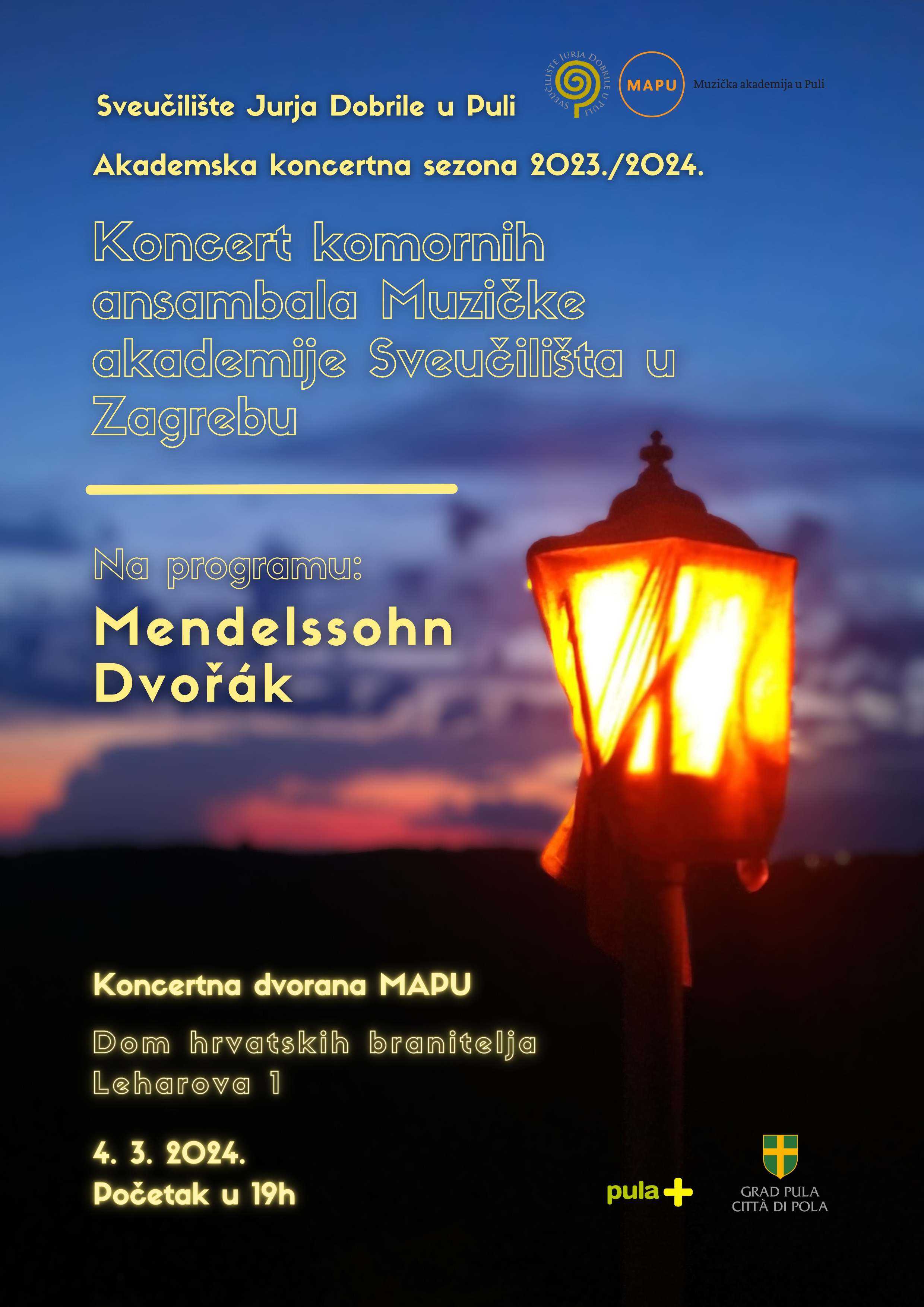 Srdačno vas pozivamo na koncert komornih ansambala Muzičke akademije Sveučilišta u Zagrebu! Koncert će se održati u koncertnoj dvorani Muzičke akademije u Domu hrvatskih branitelja, Leharova 1, u ponedjeljak, 4. ožujka 2024. s početkom u 19.00 sati. Ulaz je slobodan!