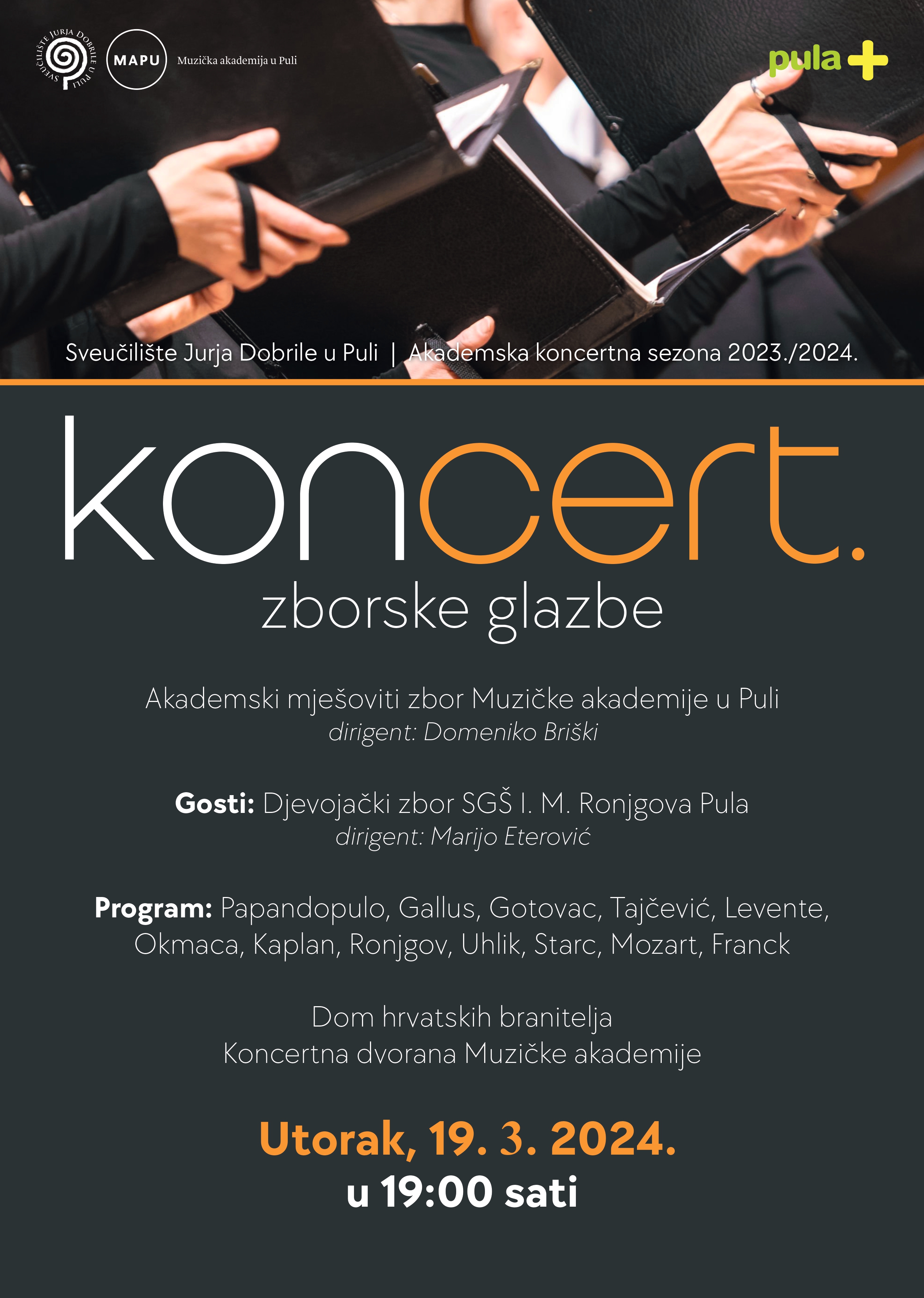Srdačno vas pozivamo na koncert zborske glazbe Akademskog mješovitog zbora Muzičke akademije u Puli pod ravnanjem Domenika Briškog. Kao gosti će nastupiti i Djevojački zbor GŠ I. M. Ronjgova Pula pod ravnanjem Marija Eterovića. Koncert će se održati u koncertnoj dvorani Muzičke akademije u Domu hrvatskih branitelja, Leharova 1, u utorak, 19. ožujka 2024. s početkom u 19.00 sati. Ulaz je slobodan!