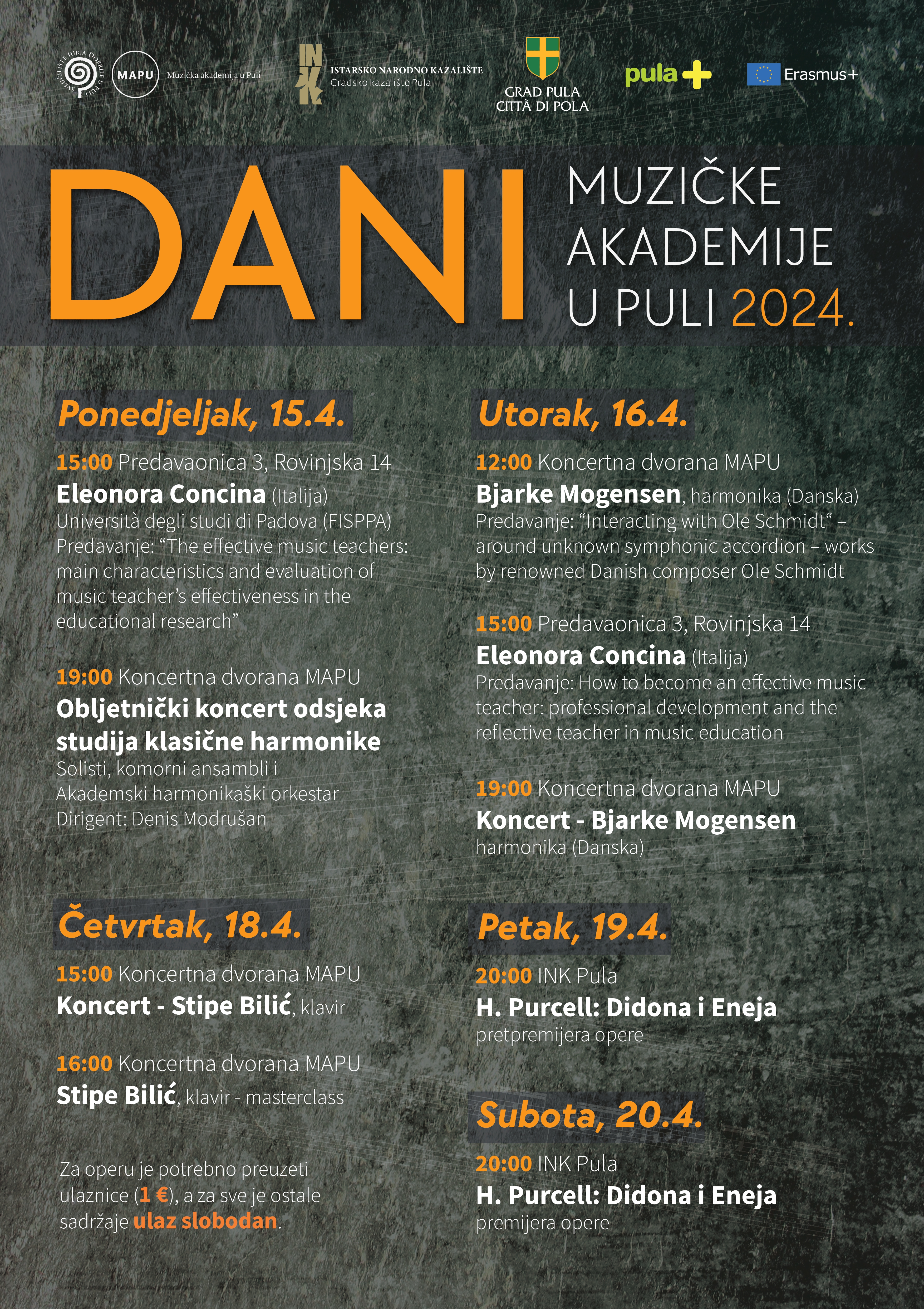 Pozivamo Vas na Dane Muzičke akademije u Puli 2024. godine! Program traje od ponedjeljka 15. travnja do subote 20. travnja, a sastoji se od koncerata, predavanja i majstorskih tečajeva. Održavat će se u Koncertnoj dvorani MAPU, Istarskom narodnom kazalištu Pula te prostorima MAPU u Rovinjskoj ulici 14. Detaljan program možete pronaći na plakatu objavljenom ispod. Ulaz na sva događanja je slobodan osim za operu, za koju je potrebno preuzeti ulaznice po cijeni od 1 eura.