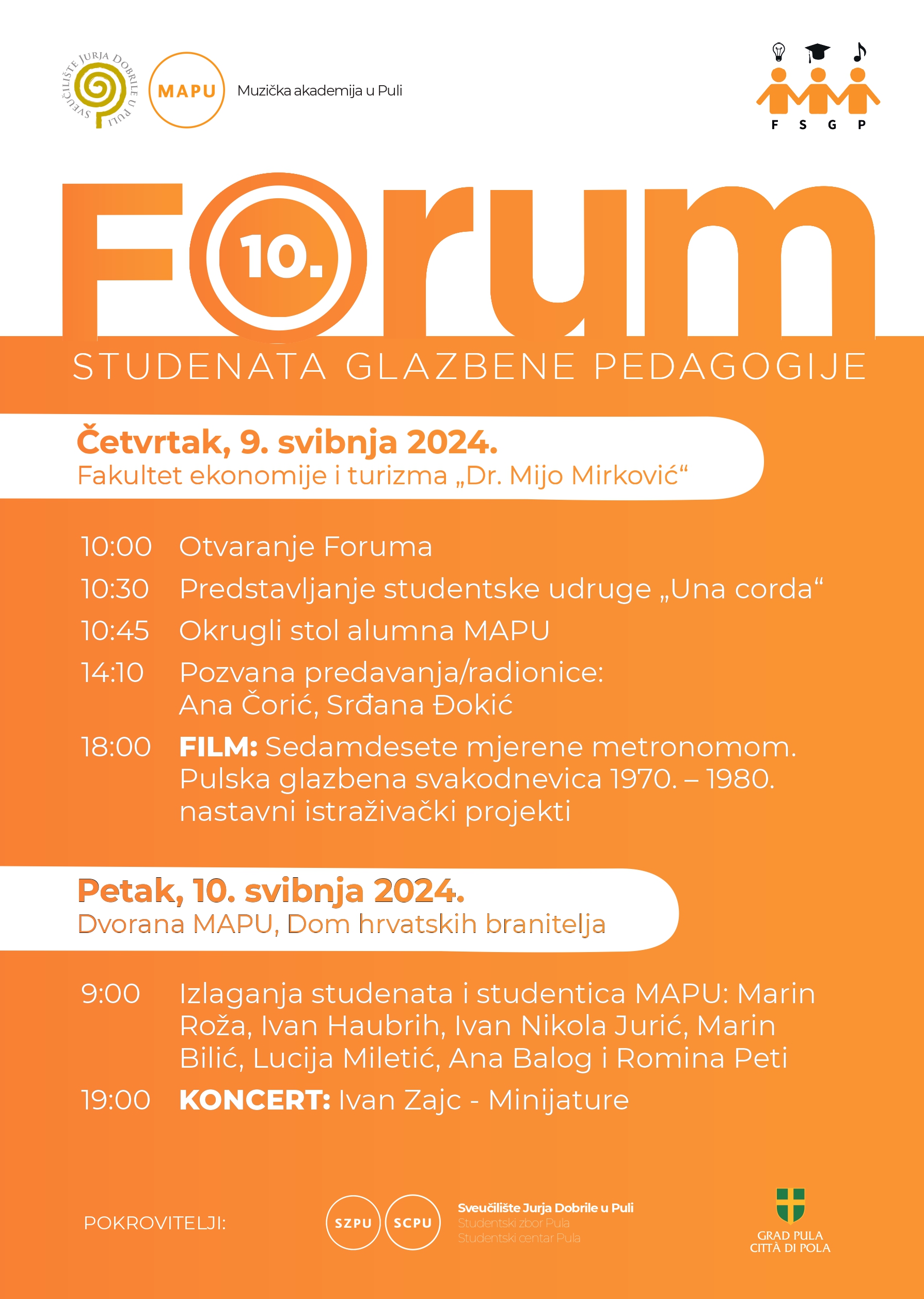 Pozivamo vas na 10. Forum studenata glazbene pedagogije koji će se održati u četvrtak i petak, 9. i 10. svibnja 2024. Forum će se u četvrtak održati na Fakultetu ekonomije i turizma "Dr. Mijo Mirković", a u petak u dvorani MAPU u Domu hrvatskih branitelja.