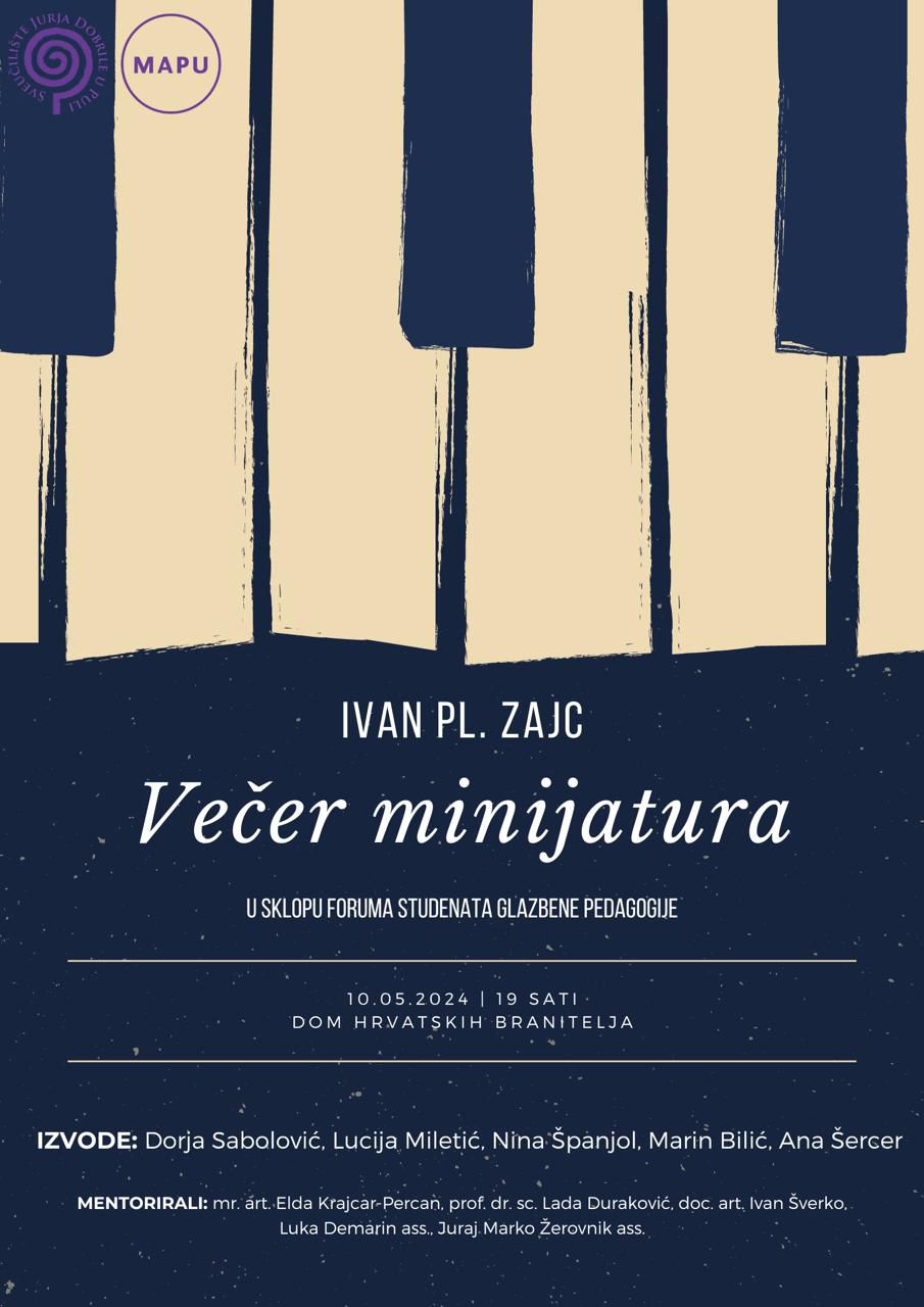 Srdačno vas pozivamo na koncert pod naslovom "Večer minijatura", na kojem će se izvesti skladbe Ivana pl. Zajca. Koncert se održava u sklopu 10. Foruma studenata glazbene pedagogije. Koncert će se održati u koncertnoj dvorani Muzičke akademije u Domu hrvatskih branitelja, Leharova 1, u petak, 10. svibnja 2024. s početkom u 19.00 sati. Ulaz je slobodan!