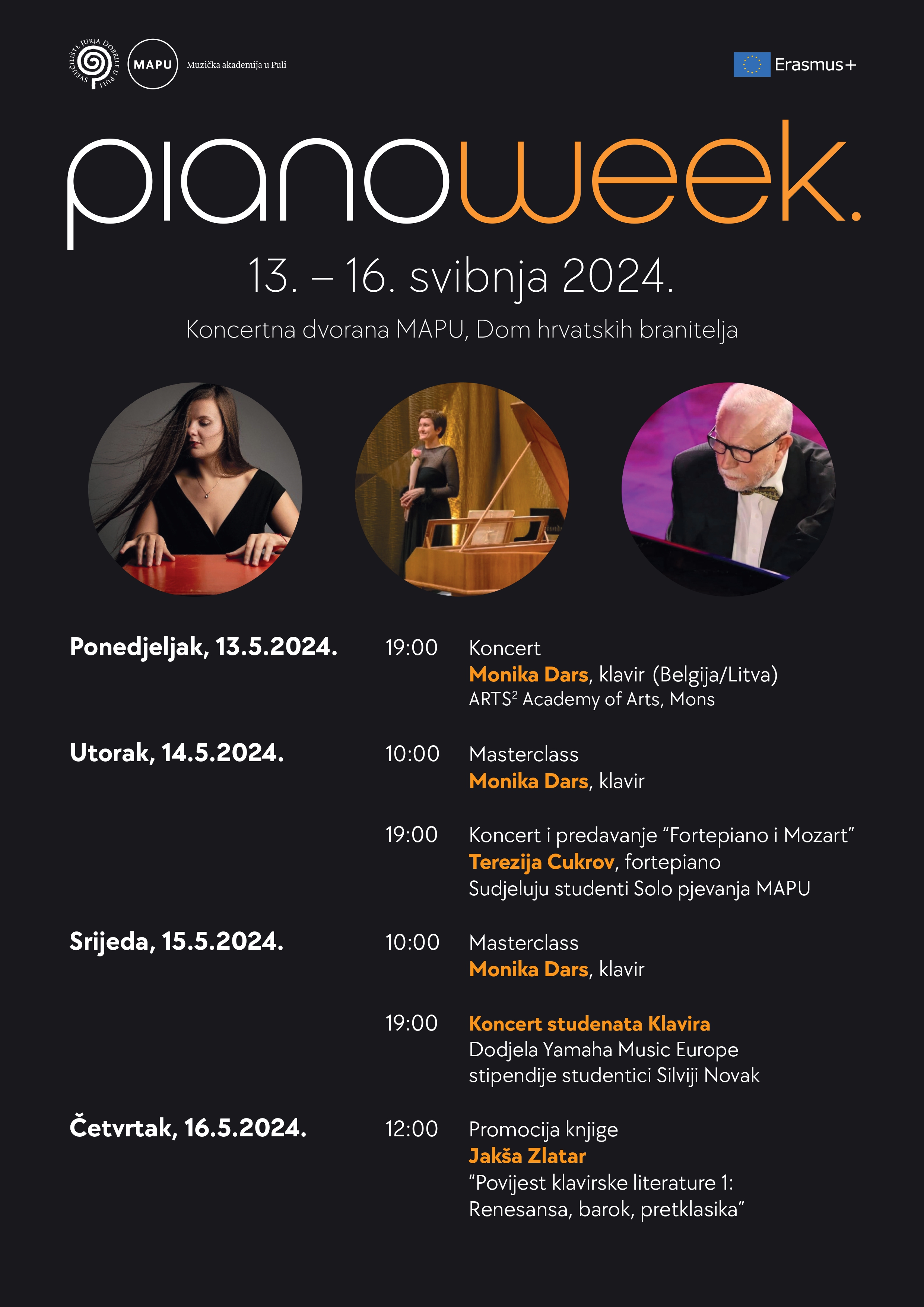 Pozivamo vas na Piano Week Muzičke akademije u Puli koji će se održati od 13. do 16. svibnja 2024. u dvorani MAPU u Domu hrvatskih branitelja. Koncerte će 13.,14., i 15. svibnja održati prof. Monika Dars s  ARTS2Academy of Arts u Monsu (Belgija), prof. Terezija Cukrov i studenti klavira MAPU. U sklopu Piano Week-a održat će se i majstorski tečaj prof. Monike Dars, dodjela Yamaha Music Europe stipendije studentici Silviji Novak te promocija nove knjige prof. Jakše Zlatara. Detaljan raspored i više informacija o predavačima i programu nalaze se u programskoj knjižici u prilogu.