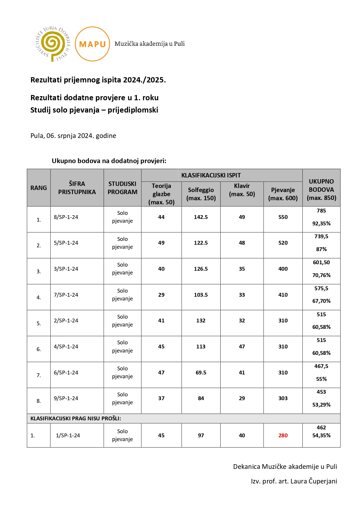 U nastavku objavljujemo rezultate dodatnih provjera u 1. roku za studij solo pjevanja.