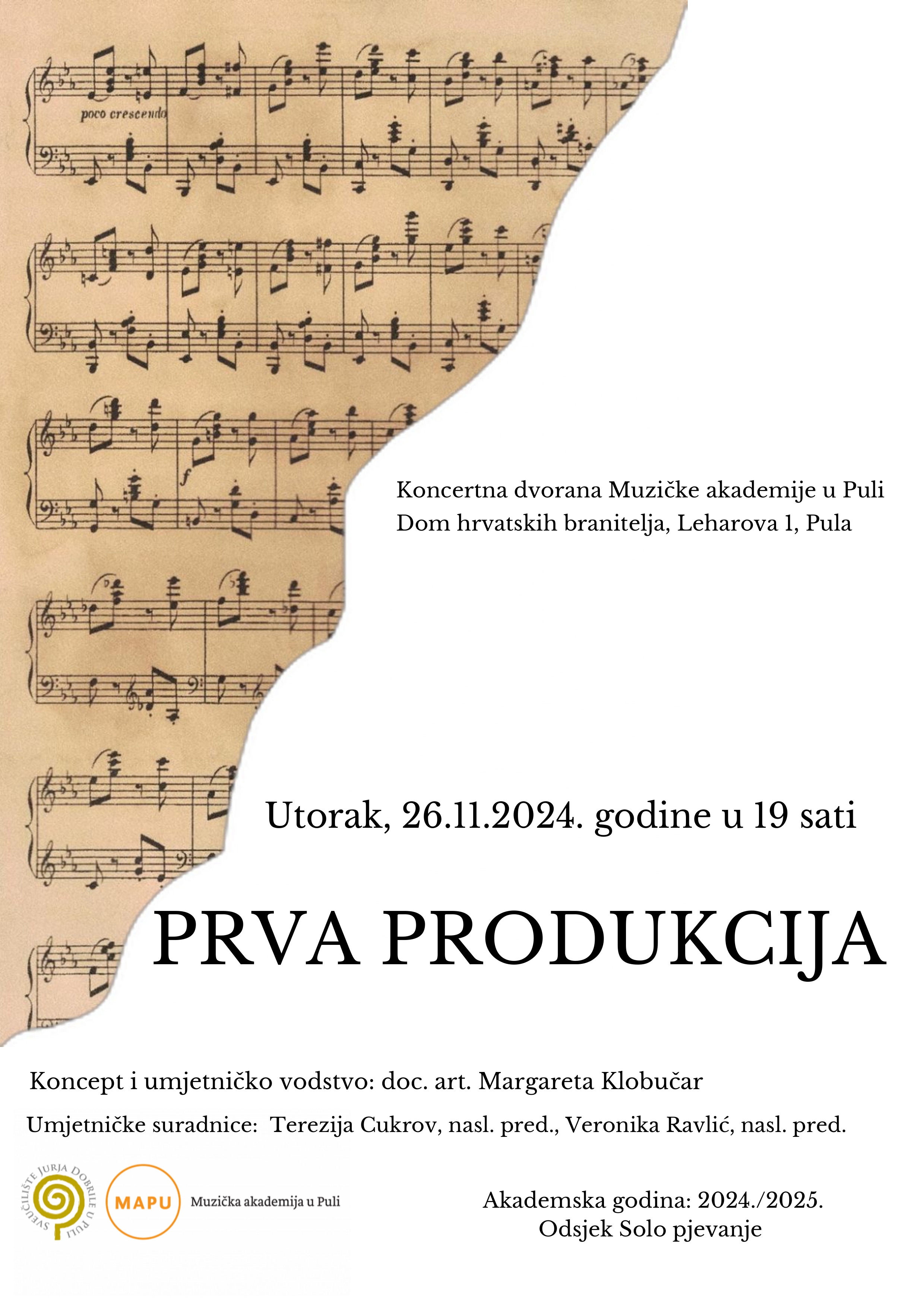 Srdačno vas pozivamo na prvu produkciju studenata Odsjeka za Solo pjevanje! Produkcija će se održati u koncertnoj dvorani Muzičke akademije, u Domu hrvatskih branitelja, Leharova 1, u utorak 26. studenog 2024. s početkom u 19.00 sati. Ulaz je slobodan!