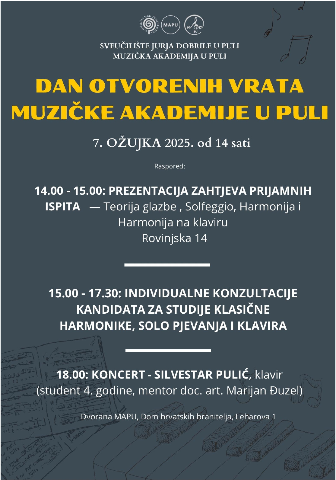 Pozivamo vas na Dan otvorenih vrata Muzičke akademije u Puli, koji će se održati 7.3.2025. od 14.00 sati. Cjelokupan program je na donjem plakatu. Za individualne konzultacije molimo najaviti se predstojnicima do 3. ožujka: prof. mr. art. Franko Božac, predstojnik studija Klasične harmonike i Solo pjevanja (franko.bozac@unipu.hr), doc. art. Marijan Đuzel, predstojnik studija Klavira  (marijan.djuzel@unipu.hr)
