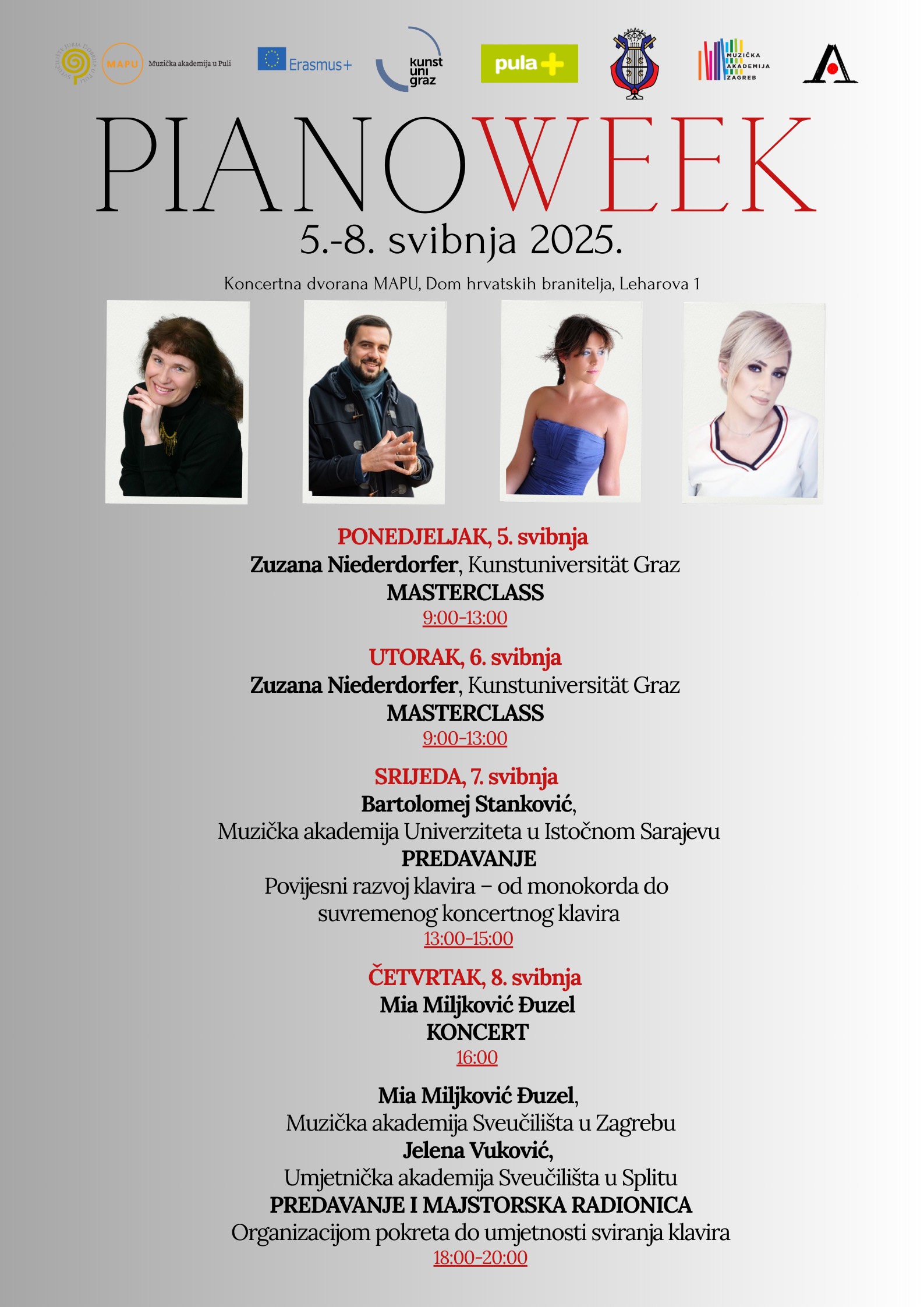 Pozivamo vas na Piano Week Muzičke akademije u Puli koji će se održati od 5. do 8. svibnja 2025. u Koncertnoj dvorani MAPU u Domu hrvatskih branitelja. Očekuju nas majstorski tečajevi, koncert, predavanja i radionice za studente klavira, a sva događanja su otvorena za publiku.