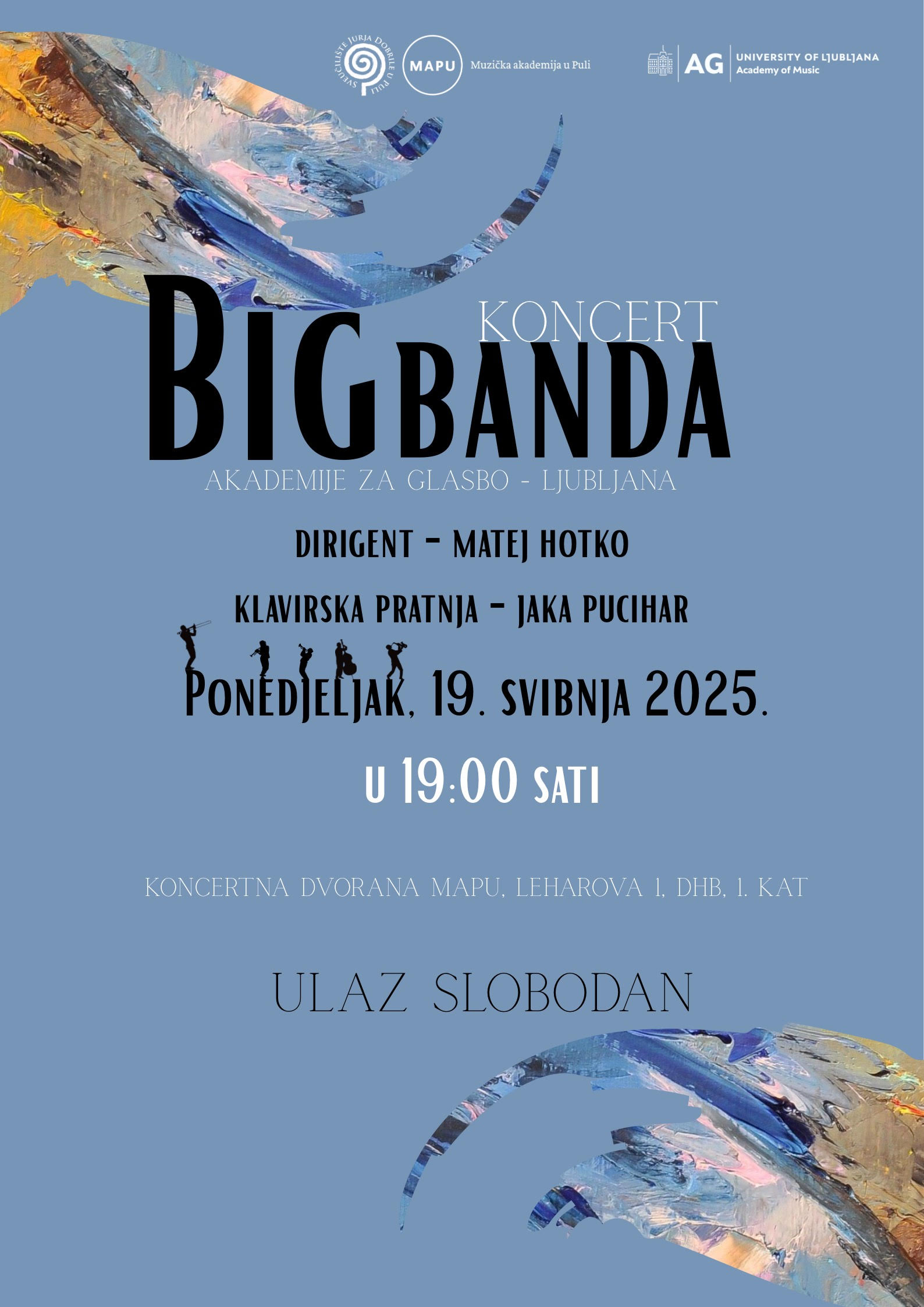 Pozivamo vas na koncert Big Banda Akademije za glasbo Sveučilišta u Ljubljani koji će se odžati u ponedjeljak, 19. svibnja s početkom u 19.00 sati. Voditelj orkestra je prof. Matej Hotko a klavirska pratnja prof. Jaka Pucihar.