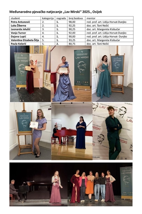 Na ovogodišnjem Međunarodnom pjevačkom natjecanju Lav Mirski održanom u Osijeku, studenti Muzičke akademije u Puli osvojili su šest prvih nagrada i jednu dugu nagradu.