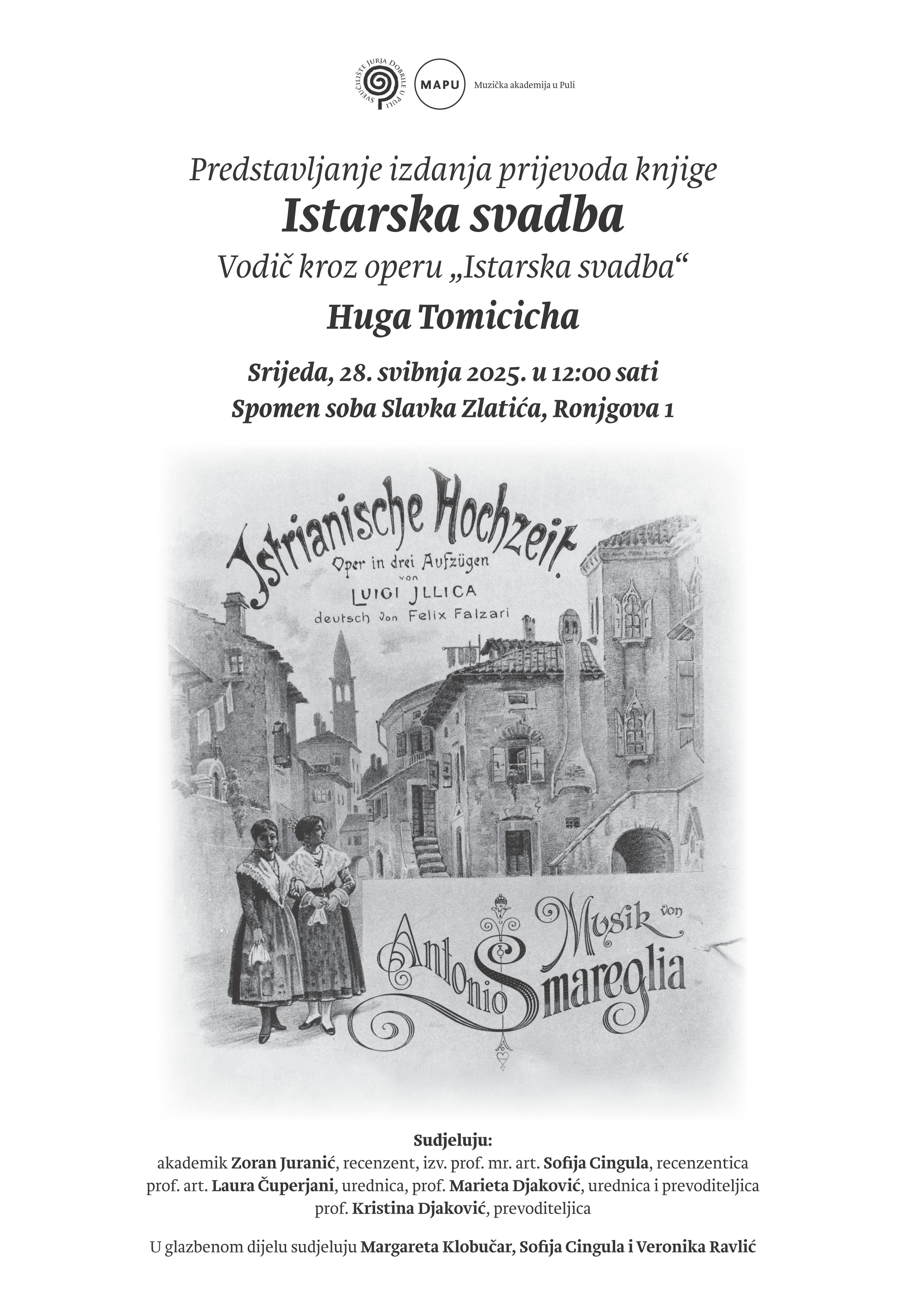 Zadovoljstvo nam je pozvati Vas na predstavljanje izdanja prijevoda knjige Istarska svadba - Vodič kroz operu "Istarska svadba" Huga Tomicicha koje će se održati u srijedu, 28. svibnja s početkom u 12.00 sati u Spomen sobi Slavka Zlatića, Ronjgova 1.