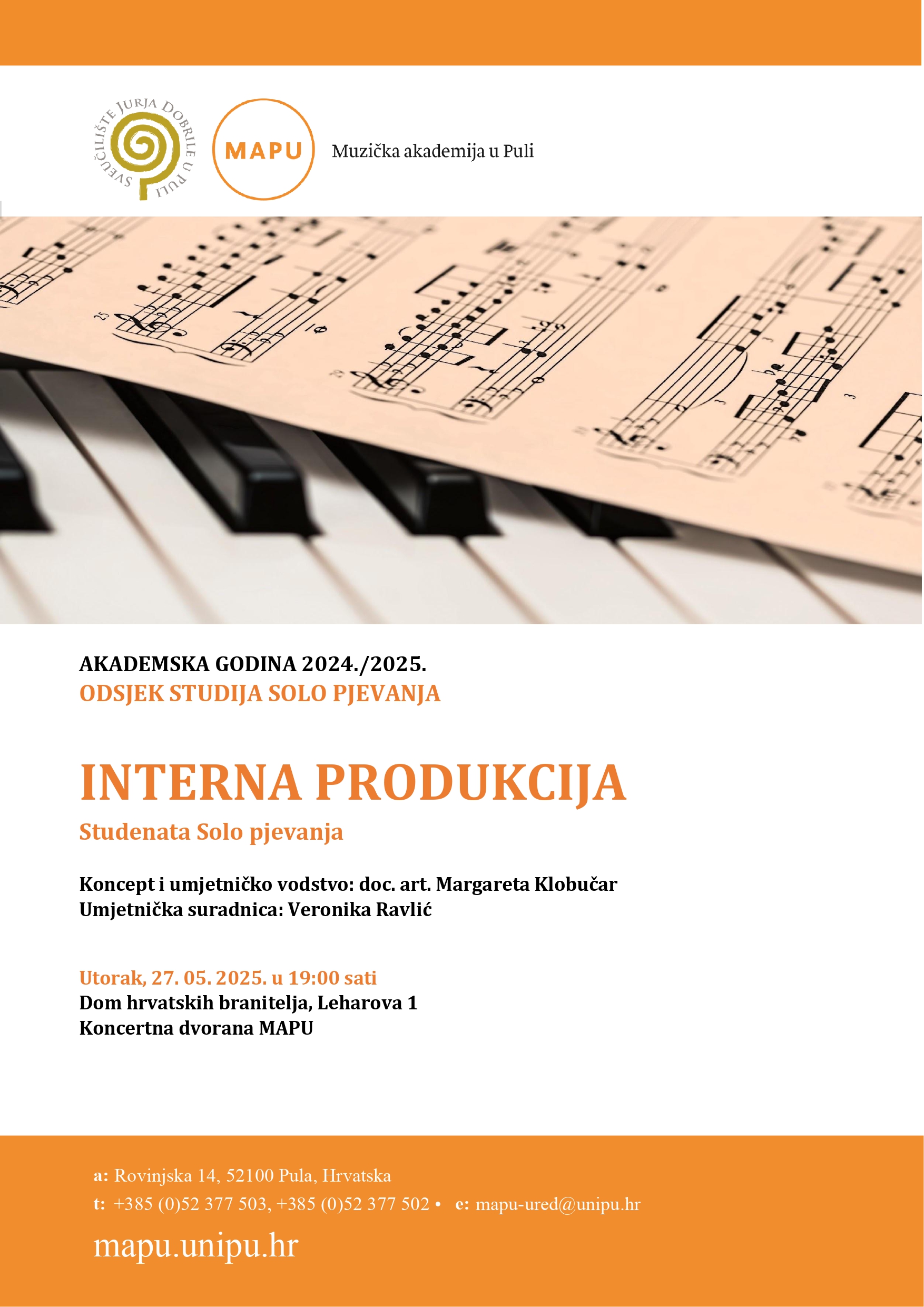 Pozivamo vas na internu produkciju klase doc. art. Margarete Klobučar, koja će se održati u utorak, 27. svibnja s početkom u 19.00 sati, u Koncertnoj dvorani MAPU, Leharova 1. Ulaz je slobodan, dobrodošli!