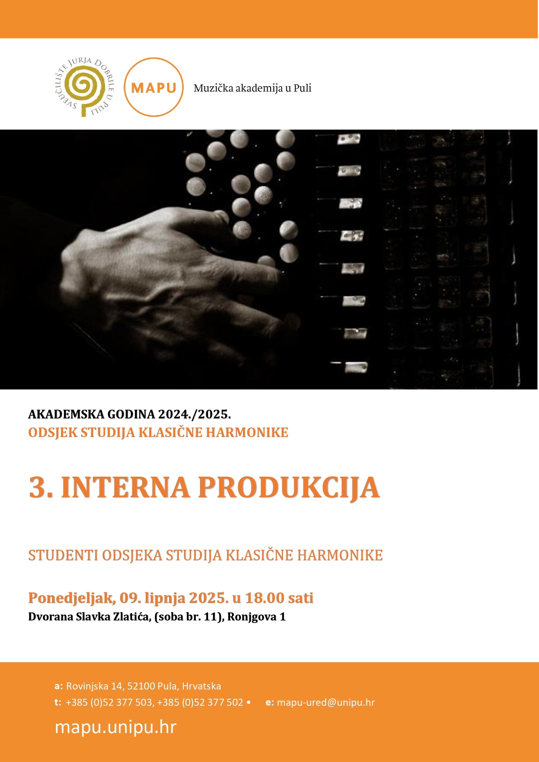 Pozivamo vas na Treću internu produkcija Odsjeka studija klasične harmonike, koja će se održati u ponedjeljak, 9. lipnja s početkom u 18.00 sati, u Dvorani Slavka Zlatića (soba br.11), Ronjgova 1. Ulaz je slobodan, dobrodošli!