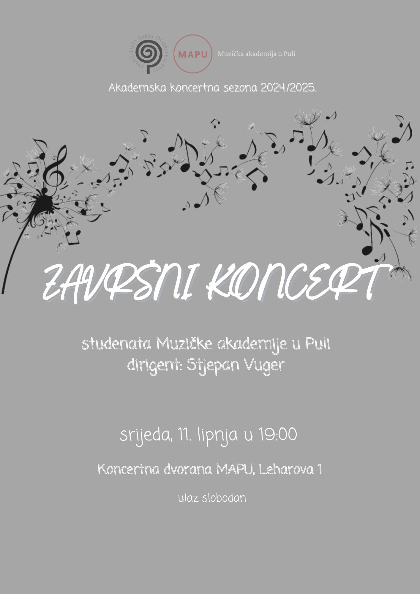 Završni koncert Muzičke akademije u Puli održati će se u srijedu, 11. lipnja, s početkom u 19:00 sati u Koncertnoj dvorani MAPU, Leharova 1, 1. kat.