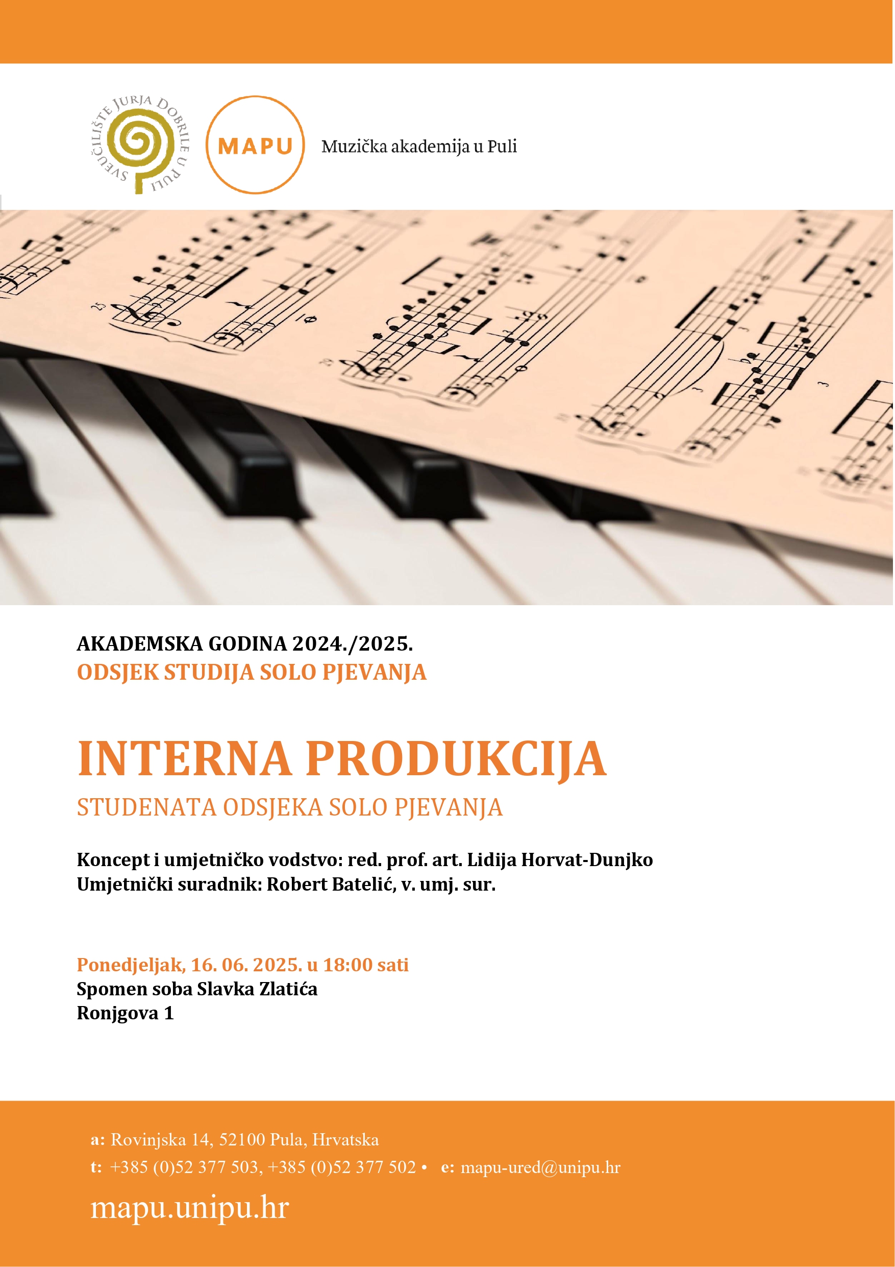 Pozivamo vas na Internu produkciju Odsjeka studija solo pjevanja, koja će se održati u ponedjeljak, 16. lipnja s početkom u 18.00 sati, u Dvorani Slavka Zlatića, Ronjgova 1. Ulaz je slobodan, dobrodošli!