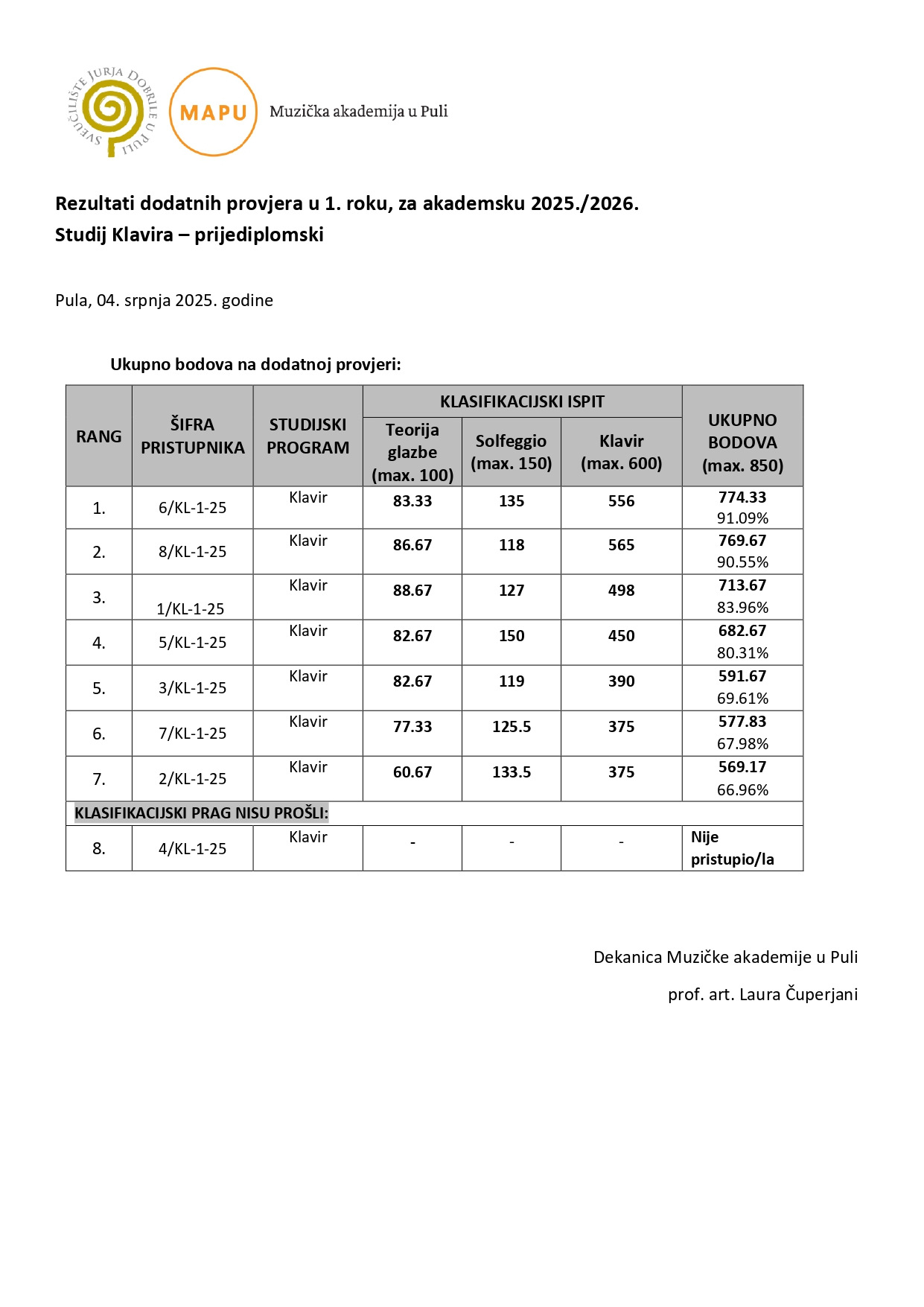 U nastavku objavljujemo rezultate dodatnih provjera u 1. roku za studij klavira.