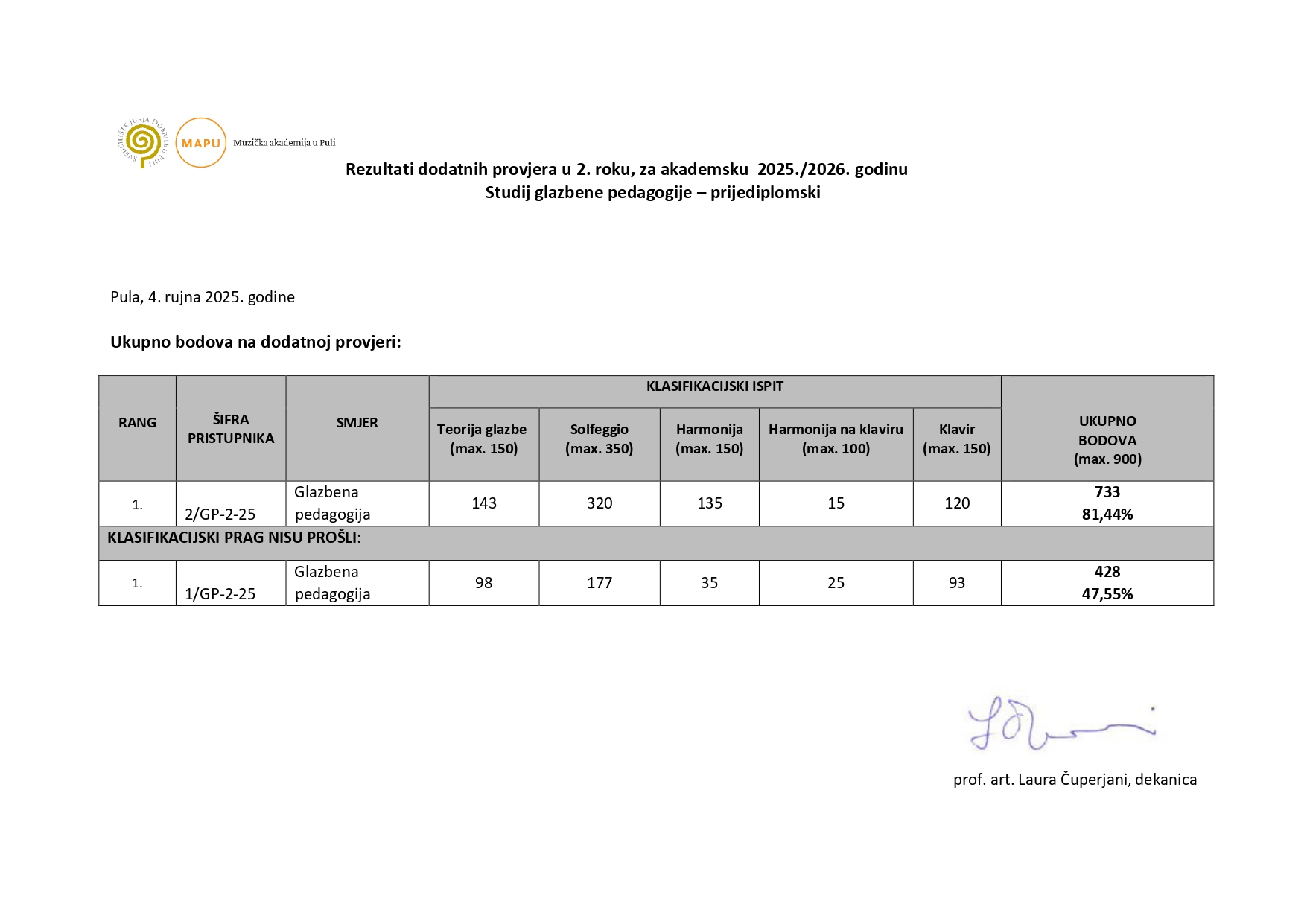 U nastavku objavljujemo rezultate dodatnih provjera u 2. roku za studij glazbene pedagogije.