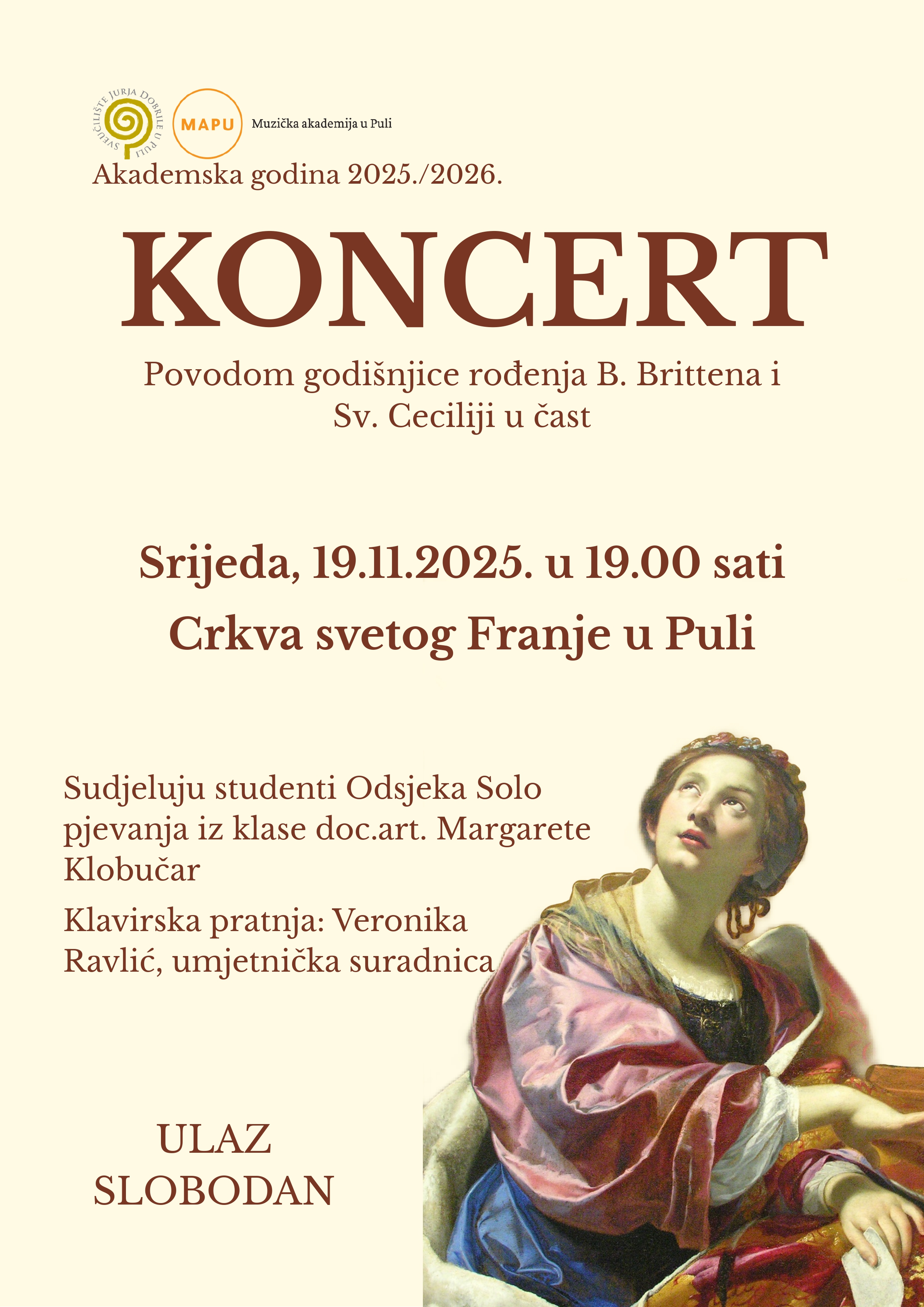 Srdačno vas pozivamo na Koncert povodom godišnjice rođenja B. Brittena i Sv. Ceciliji u čast. Koncert će se održati u srijedu, 19. studenog 2025. u 19.00 sati u Crkvi sv. Franje u Puli. Sudjeluju studenti Odsjeka Solo pjevanja iz klase doc. art. Margarete Klobučar, uz klavirsku pratnju umj. sur. Veronike Ravlić. Ulaz je slobodan.