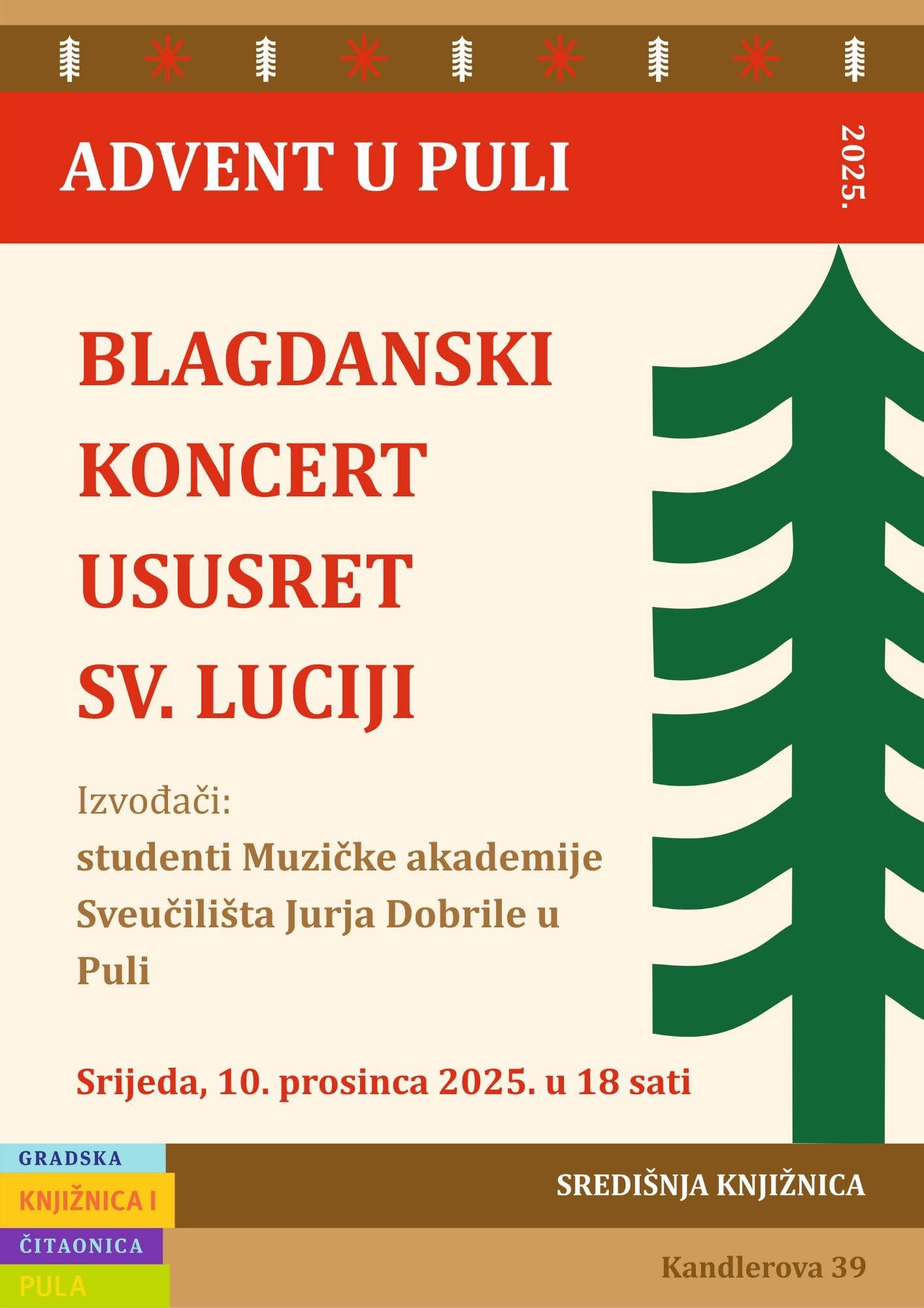 Pozivamo vas na Blagdanski koncert ususret Sv. Luciji koji će se odžati u srijedu, 10. prosinca s početkom u 18.00 sati, u Središnjoj knjižnici Pula, Kandlerova ul. 39. Nastupit će studenti Muzičke akademije Sveučilišta Jurja Dobrile u Puli. Ulaz je slobodan, dobrodošli!
