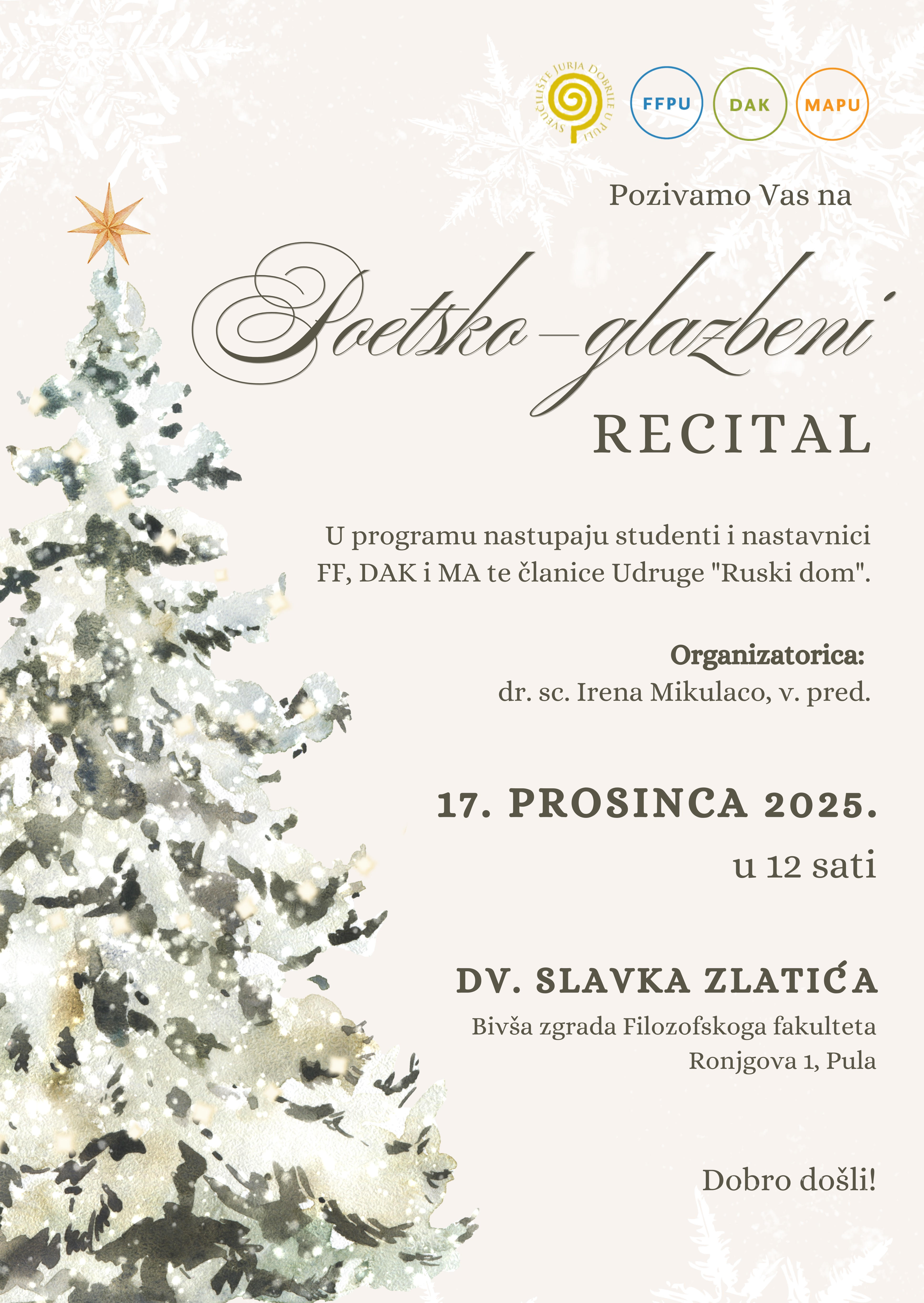 Pozivamo Vas na Poetsko-glazbeni recital koji će se održati 17. prosinca s početkom u 12.00 sati u Dvorani Slavka Zlatića, Ronjgova 1. Sudjeluju studenti i nastavnici Muzičke akademije u Puli, Filozofskog fakulteta, studija Dizajna i audiovizualnih komunikacija te članice Udruge "Ruski dom".