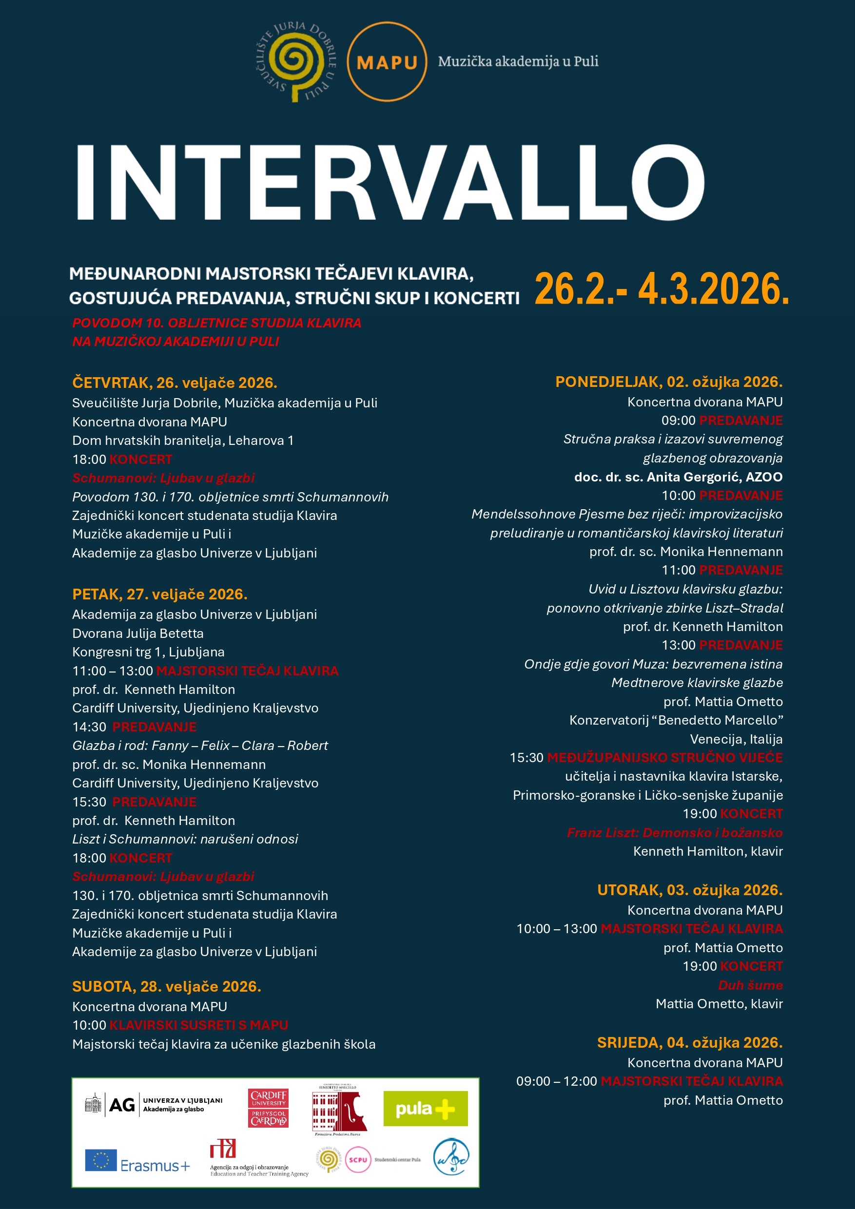 Srdačno Vas pozivamo na manifestaciju INTERVALLO, koju po drugi put organizira Odsjek studija klavira MAPU. U sklopu projekta održat će se majstorski tečajevi klavira, gostujuća predavanja, stručni skup i koncerti. Detaljan program projekta možete pročitati na plakatu i programskoj knjižici u prilogu.  Ulaz je slobodan