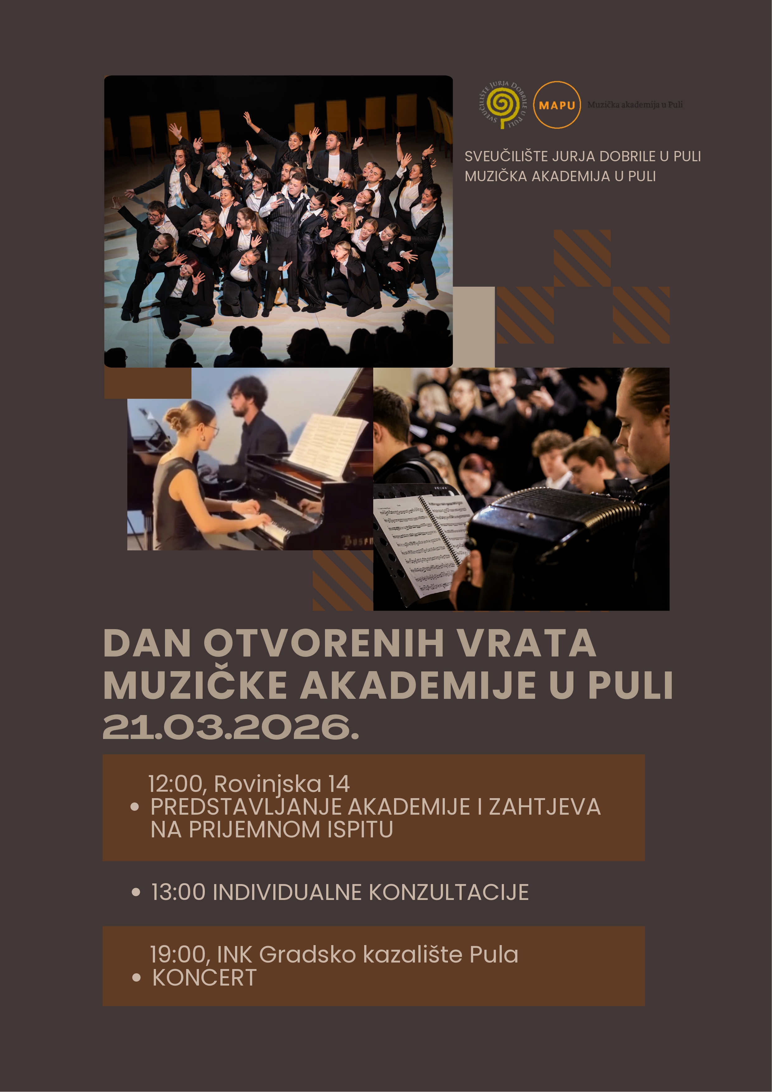 Pozivamo vas na Dan otvorenih vrata Muzičke akademije u Puli, koji će se održati 21.3.2026. od 12.00 sati. Cjelokupan program je na donjem plakatu. Za individualne konzultacije molimo najaviti se predstojnicima odsjeka: prof. mr. art. Franko Božac, predstojnik studija Klasične harmonike i Solo pjevanja (franko.bozac@unipu.hr), doc. art. Marijan Đuzel, predstojnik studija Klavira  (marijan.djuzel@unipu.hr)