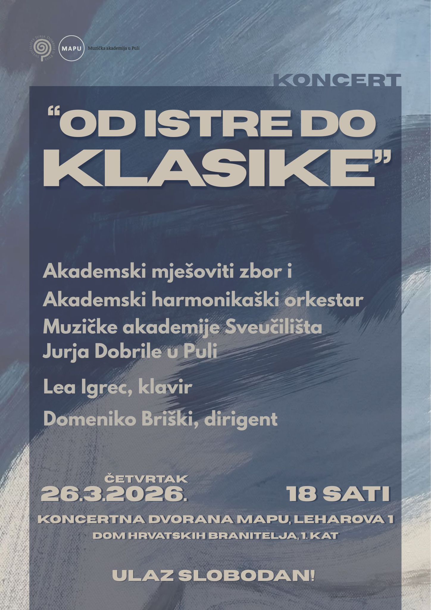 Srdačno vas pozivamo na koncert "Od Istre do klasike" na kojem će nastupiti akademski mješoviti zbor i akademski harmonikaški orkestar MAPU. Nastupit će i Lea Igrec za klavirom, a ansamblima će ravnati dirigent Domeniko Briški. Koncert će se održati u četvrtak, 26. ožujka 2026., s početkom u 18 sati, u Koncertnoj dvorani MAPU, Leharova 1 (Dom hrvatskih branitelja, 1.kat). Ulaz je slobodan!