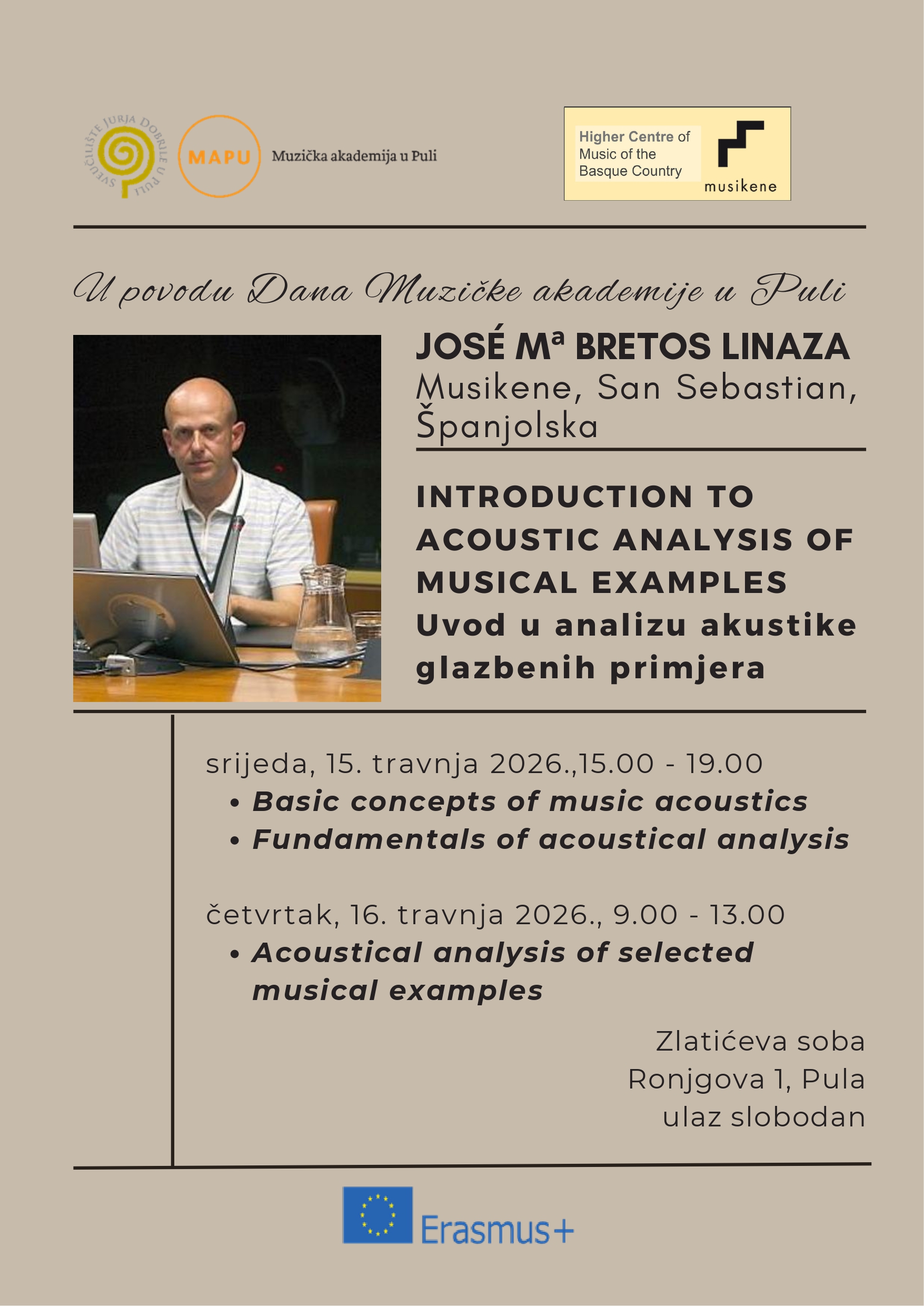 Gostujući profesor José Mª Bretos Linaza (Musikene, San Sebastián, Španjolska) održat će predavanje pod nazivom „Introduction to acoustic analysis of musical examples / Uvod u analizu akustike glazbenih primjera“. Predavanje će biti organizirano u tri dijela kako bi se omogućilo kvalitetno praćenje tematike, a održat će se u Zlatićevoj sobi (Ronjgovljeva 1) u sljedećim terminima: