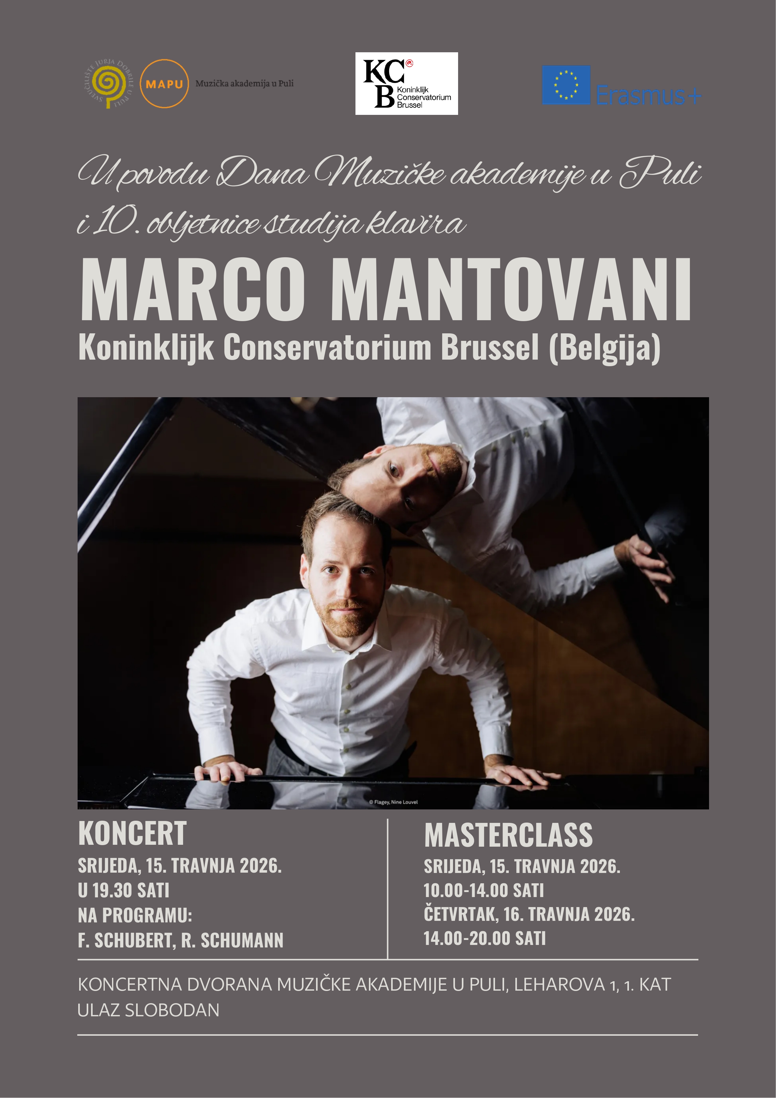 U srijedu, 15. travnja 2026. godine, pijanist Marco Mantovani (Koninklijk Conservatorium Brussel, Belgija), asistent na Kraljevskom konzervatoriju u Bruxellesu od 2019. godine, koji je 2026. doktorirao na temu Roberta Schumanna i odnosa glazbe i književnosti, održat će recital u Koncertnoj dvorani Muzičke akademije u Domu hrvatskih branitelja (Leharova 1) s početkom u 19:30 sati. Na programu su djela Schuberta i Schumanna.